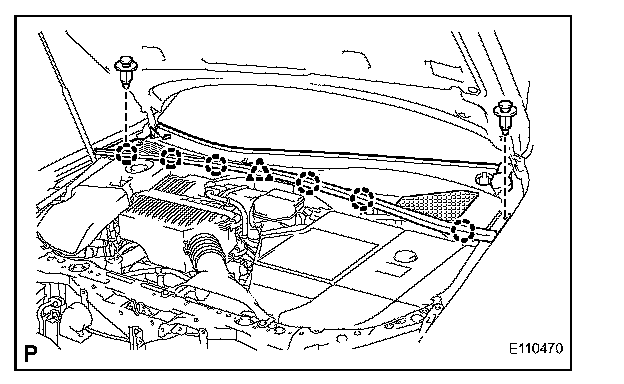 b. Disengage the 6 claws and the clamp, and remove the cowl top ventilator louver sub-assembly.