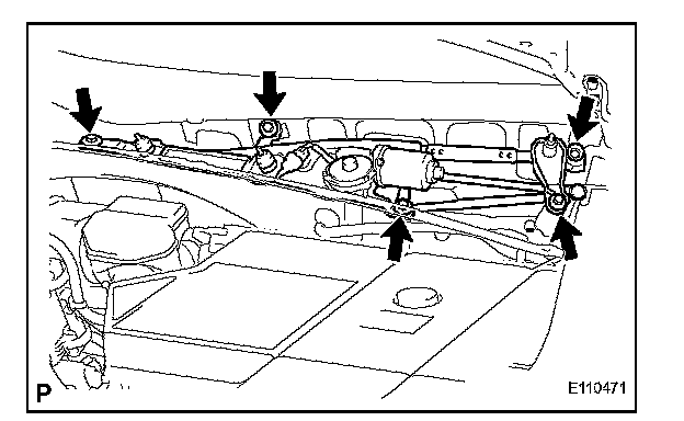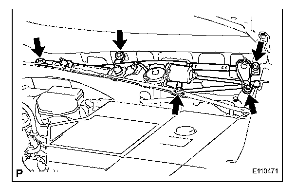 b. Remove the 5 bolts and the windshield wiper motor and link assembly.