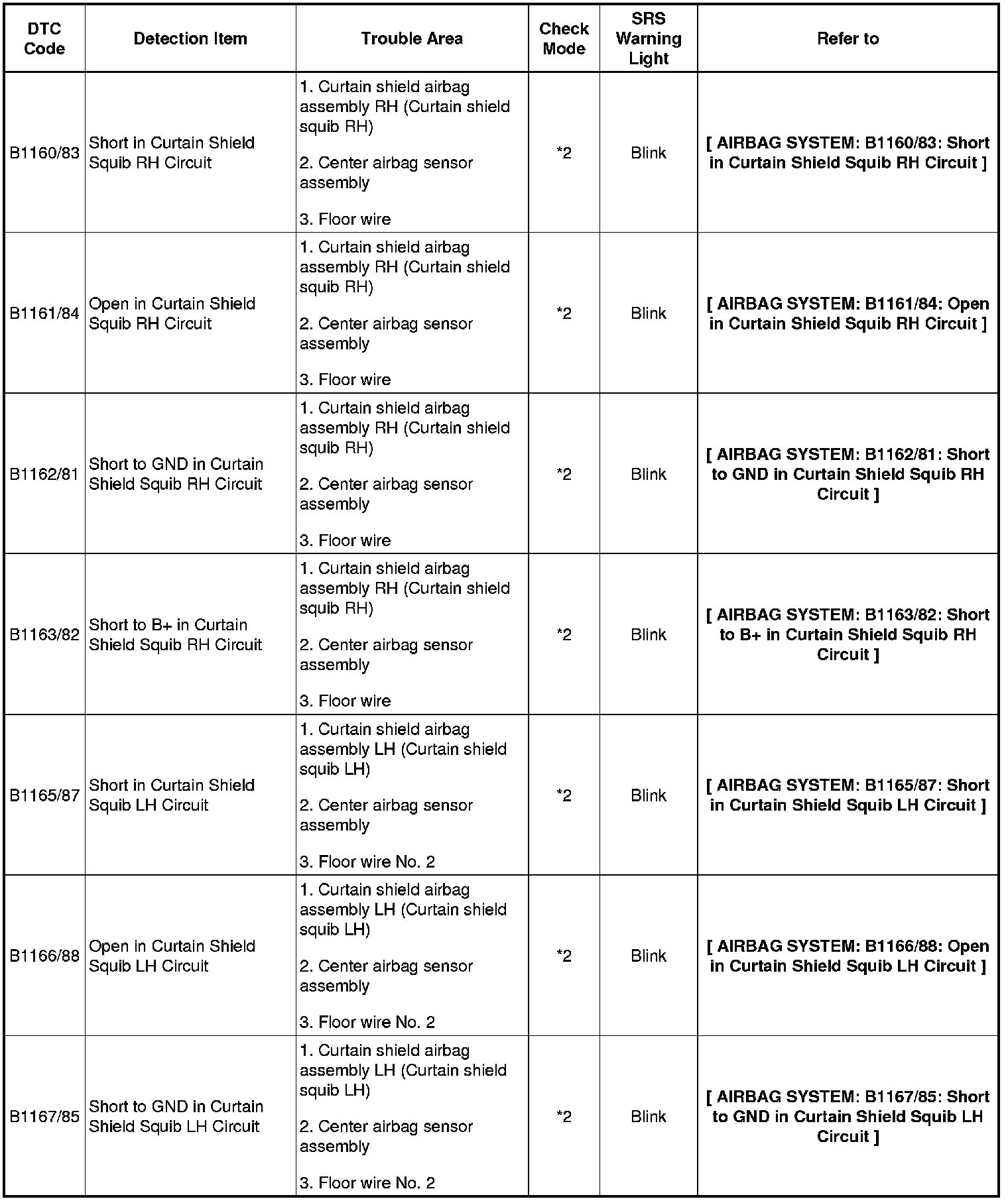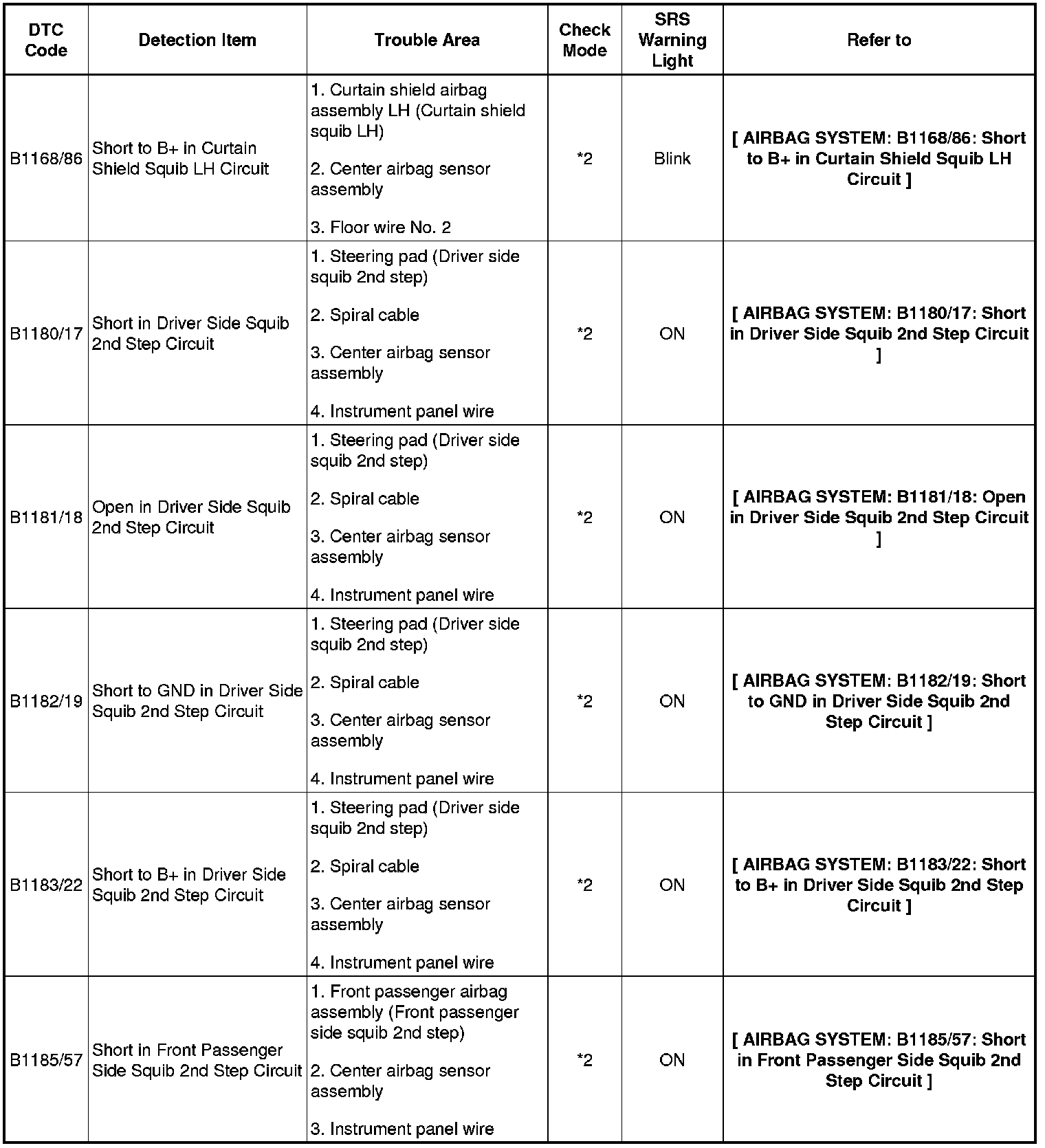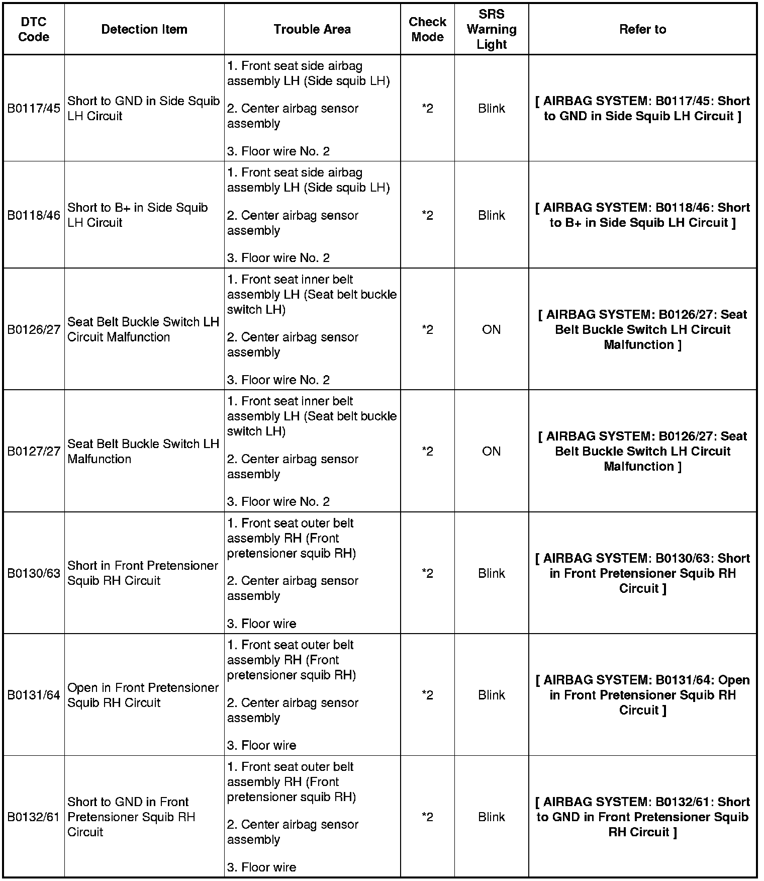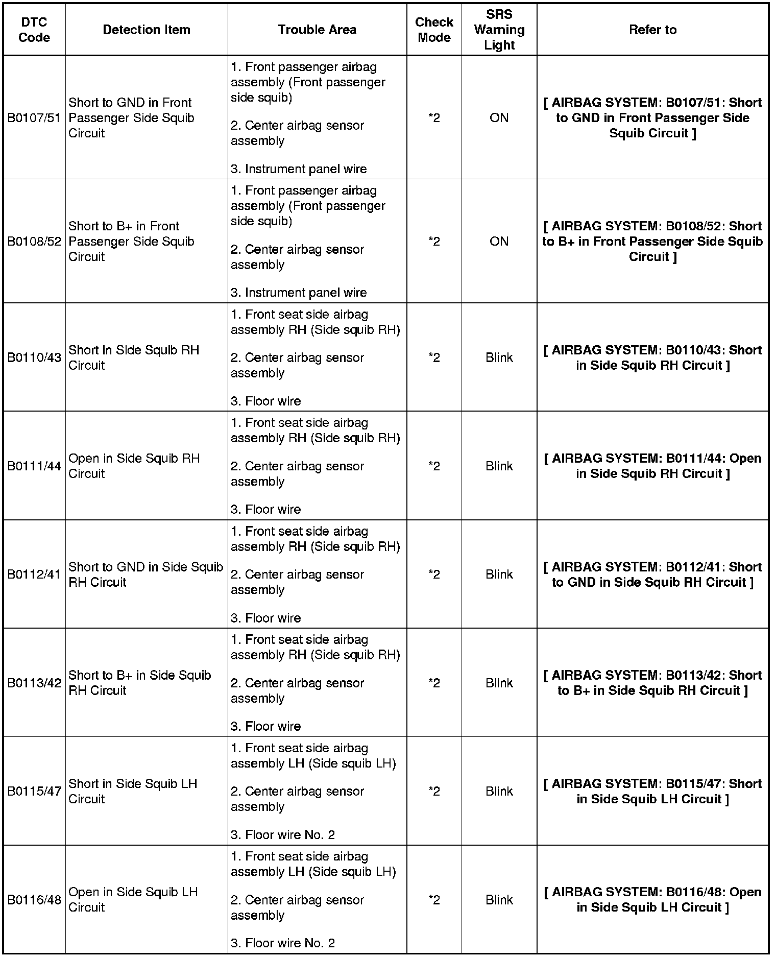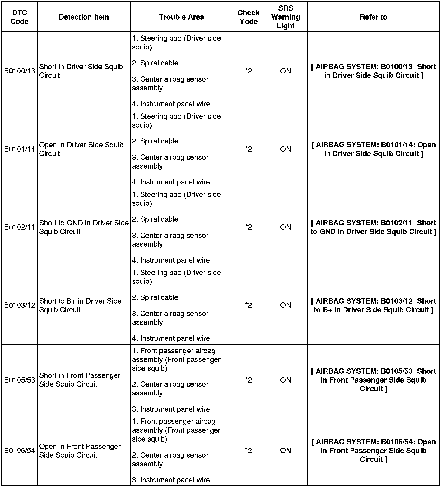 - In the case of any malfunction concerning an open circuit, short to ground, or short to B+ due to a squib, other trouble codes may not be detected. In this case, repair the malfunction currently indicated and then perform malfunction diagnosis again.