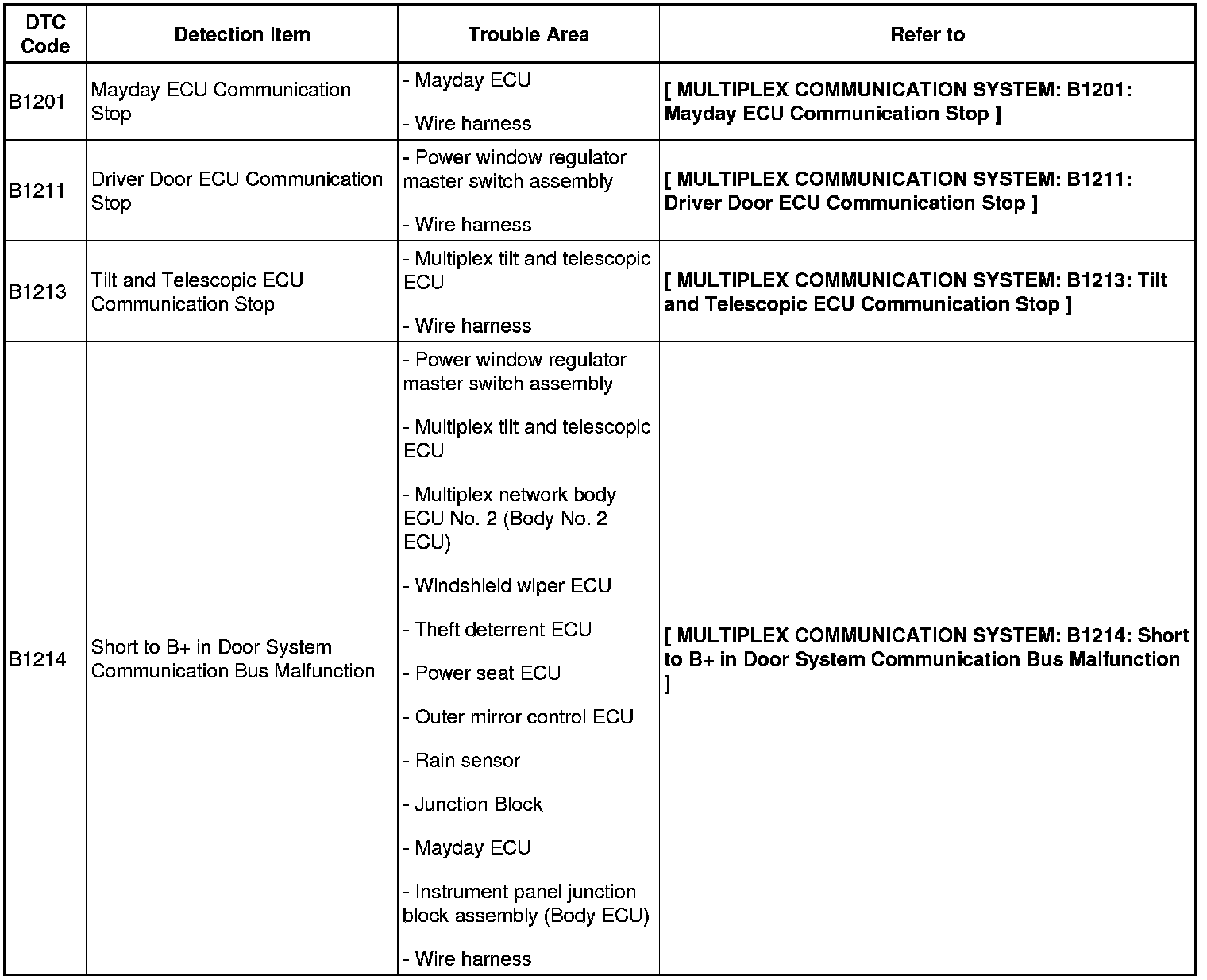 HINT: When DTC of "+B or GND short malfunction of communication bus B1214 and B1215 are detected at the same time as "communication stop" DTC B1201, B1211, B1213, B1218, B1245, B1269, B1272, B1276, and B1279, repair DTC of "+B or GND short malfunction of communication bus" first.