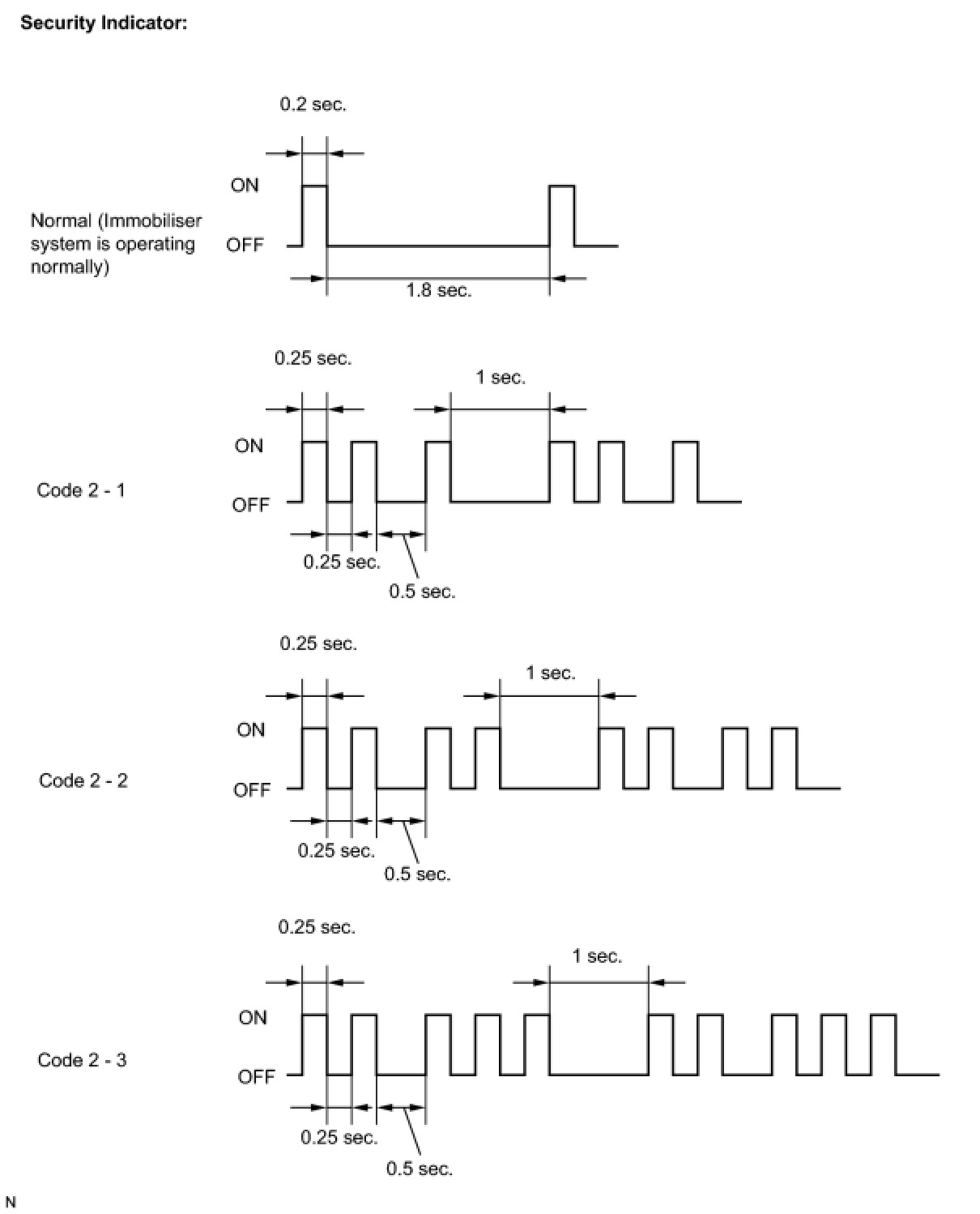 - When the immobilizer system is operating normally and the key is pulled out, the security indicator blinks continuously.