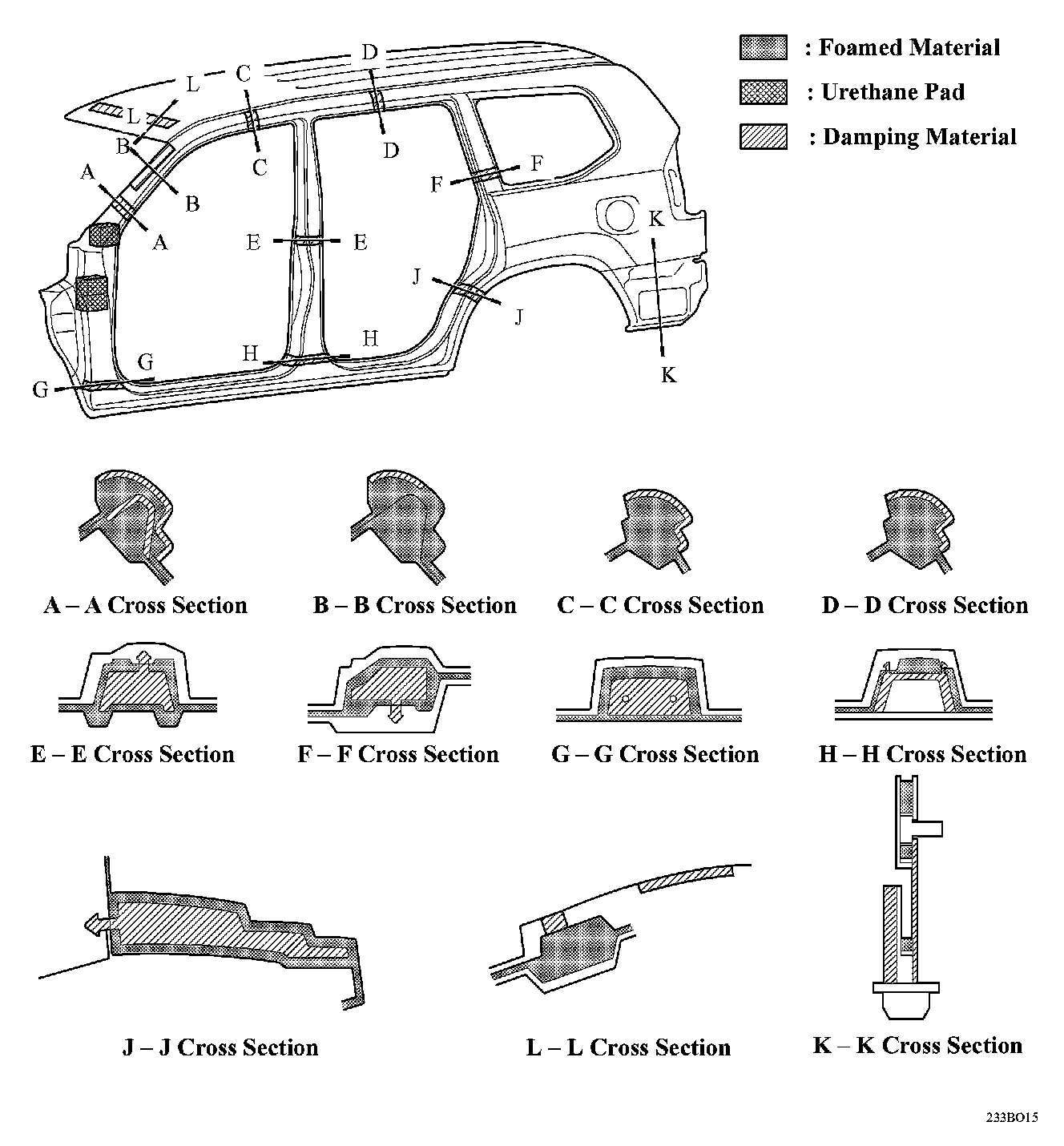 ^ Foamed materials and urethane pad damping materials are allocated throughout the vehicle. As a result, the wind and road noises that are transmitted to the rockers and pillars have been reduced.