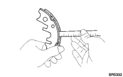 If the lining thickness is at the minimum thickness or less, or if there is severe or uneven wear, replace the brake shoe.