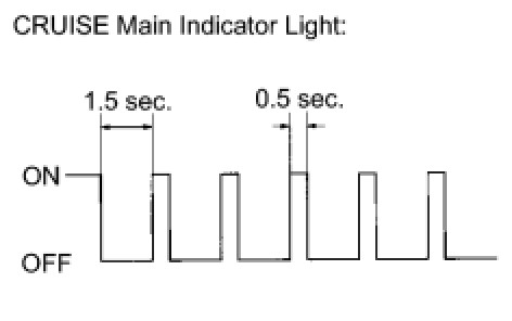 HINT: While driving with cruise control, the ECM activates AUTO CANCEL of the cruise control system when a malfunction occurs in one of the following: vehicle speed sensors, stop light switch, or other related parts. When AUTO CANCEL is activated, the CRUISE main indicator light outputs the blinking pattern shown to the left. At the same time, data of the malfunction is stored as a DTC.
