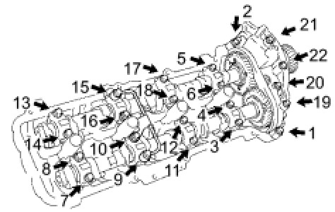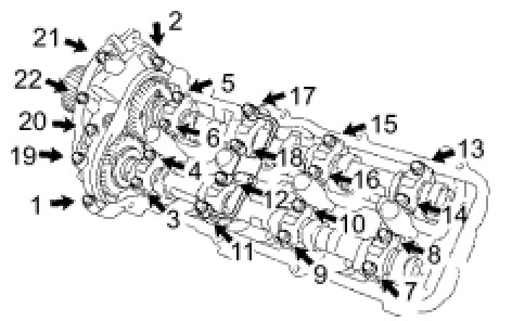 (4) Uniformly loosen the 22 bearing cap bolts in the order shown in the illustration, then remove all the bolts.