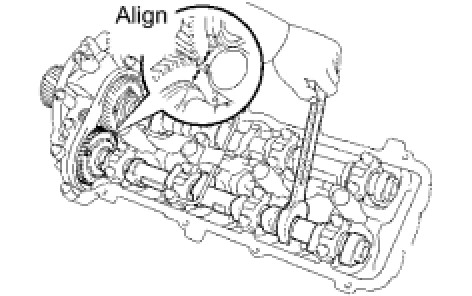 (3) Align the timing marks (2-dot marks) of the camshaft drive and driven gears by turning the hexagonal portion of the exhaust camshaft with a wrench.