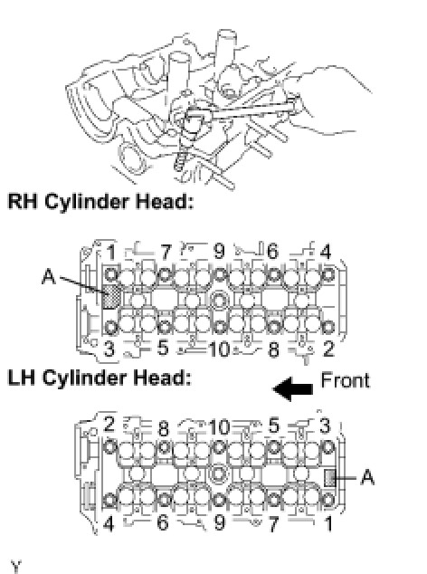 (a) Uniformly loosen the 10 cylinder head bolts on one side of each cylinder head in several steps, in the order shown in the illustration. Likewise, loosen the 10 bolts on the other side. Remove the 20 cylinder head bolts and plate washers.