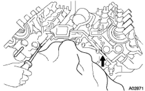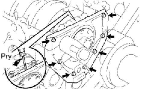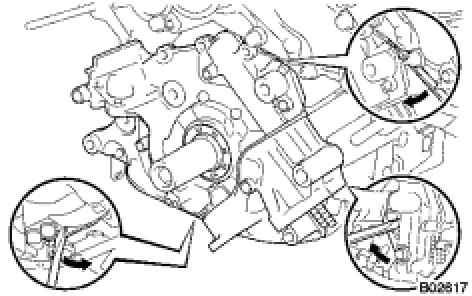 (b) Using a screwdriver, remove the oil pump by prying the portions between the oil pump and cylinder block.