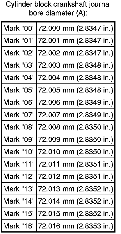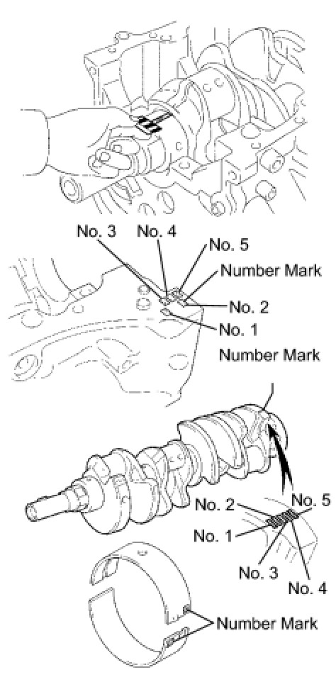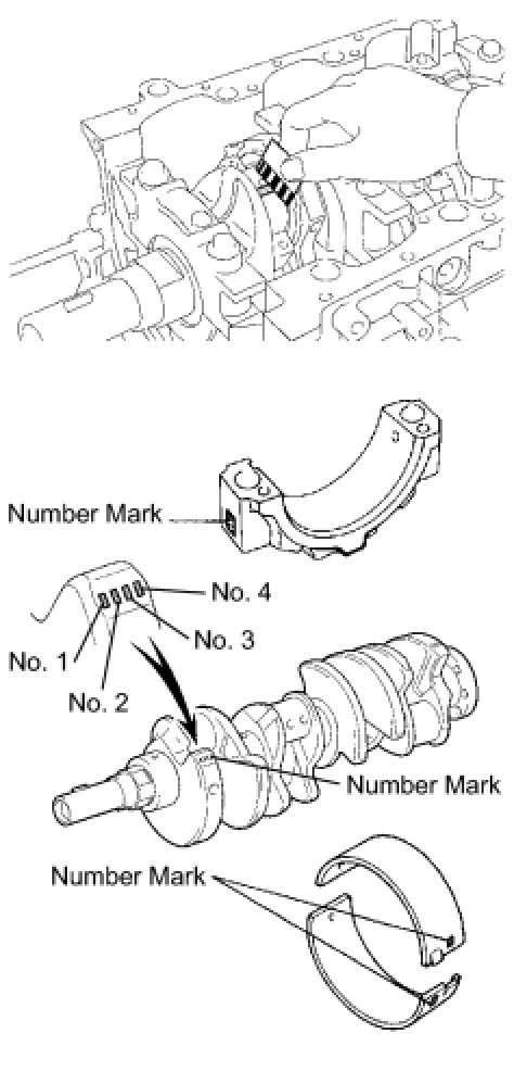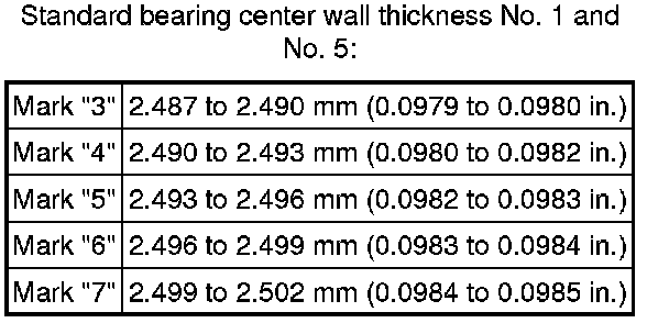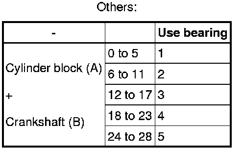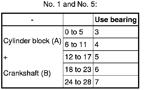 HINT: If using a standard bearing, replace it with one having the same number. If the number of the bearing cannot be determined, add together the numbers imprinted on the cylinder block and crankshaft, then refer to the table below for the appropriate bearing number. There are 5 sizes of the standard bearings. For No. 1 and No. 5 position bearings, use bearings marked "3", "4", "5", "6" and "7". For the other position bearings, use bearings marked "1", "2", "3", "4" and "5".