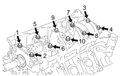 (a) Uniformly loosen and remove the 10 crankshaft bearing cap bolts in several steps, in the order shown in the illustration.