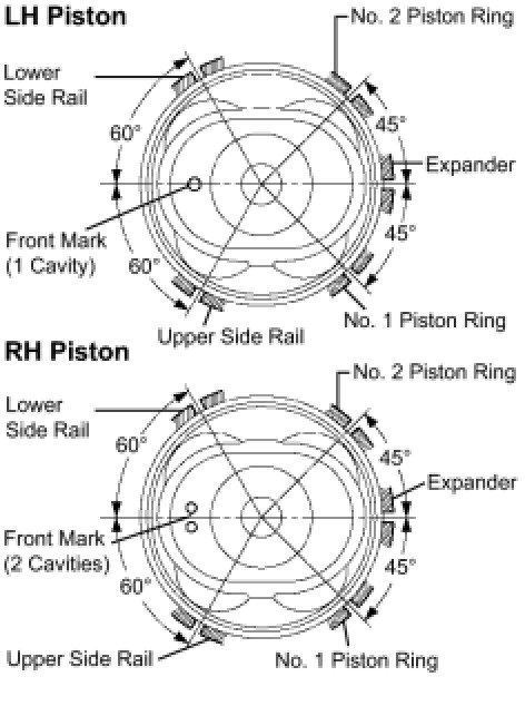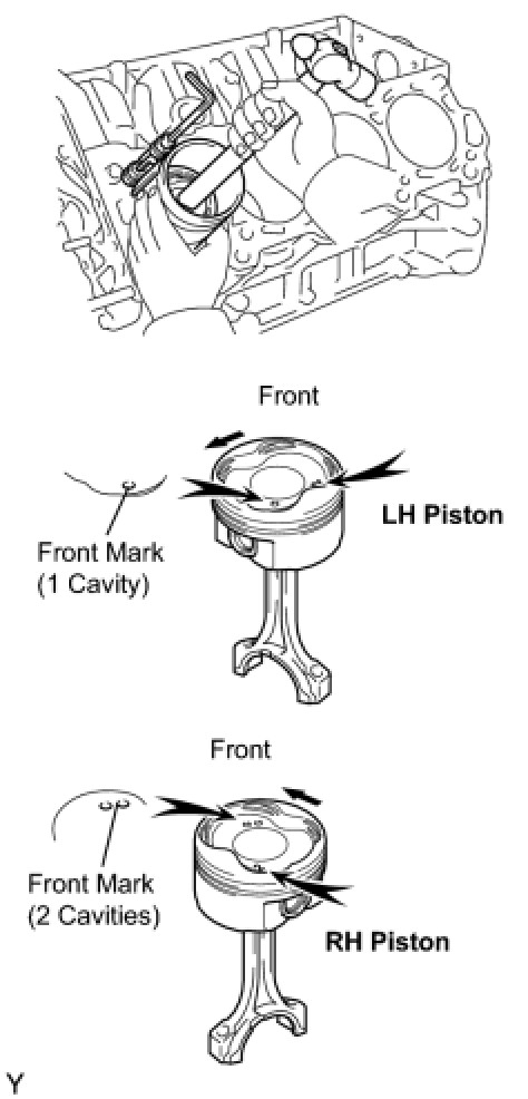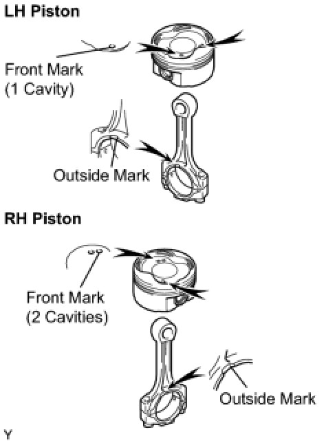 NOTE: The installation directions of the piston and connecting rod are different for the LH and RH banks. The LH piston is marked with 1 cavity and "2", the RH piston with 2 cavities and "2".