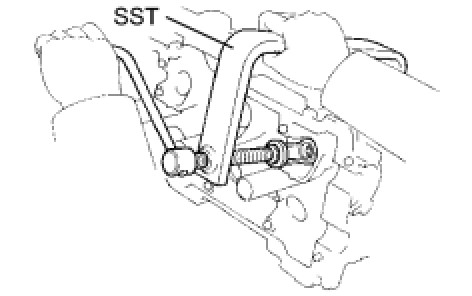 (d) Using SST, align the holes of the driven main gear and sub gear by turning the sub gear clockwise, and temporarily install a service bolt.