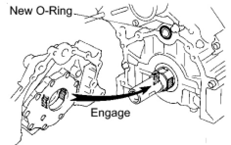 (d) Engage the spline teeth of the oil pump drive gear with the large teeth of the crankshaft, and slide the oil pump on the crankshaft.