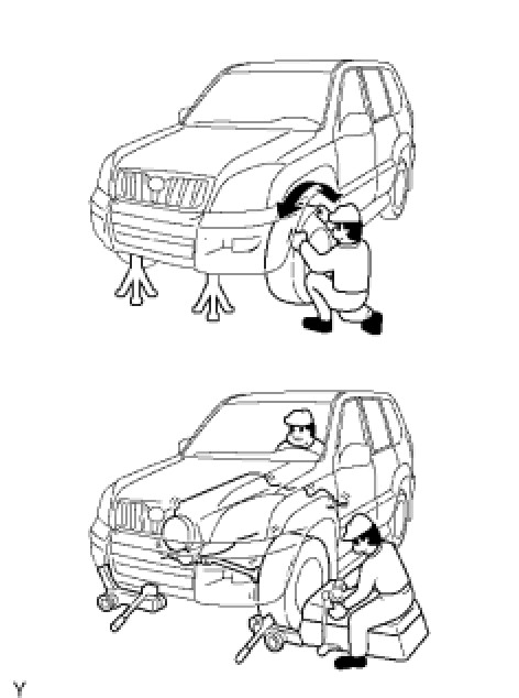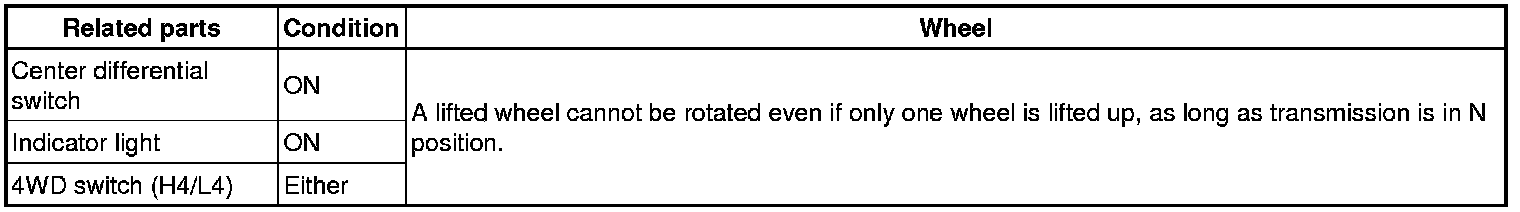 When doing on-vehicle wheel balancing on a full-time 4WD vehicle, to prevent each wheel from being rotated at different speed in different directions (which could damage the center differential), always be sure to observe the following precautions.