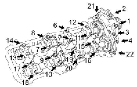 Uniformly tighten the 22 bearing cap bolts in several steps, in the order shown in the illustration.
