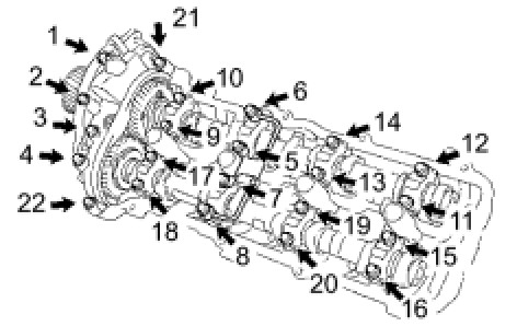 Camshaft Bearing RHUniformly tighten the 22 bearing cap bolts in several steps, in the order shown in the illustration.