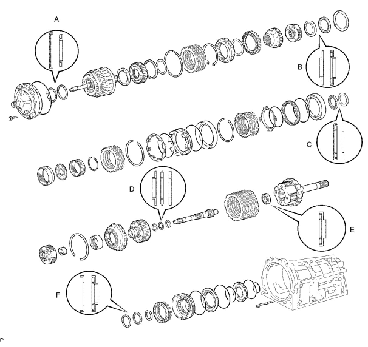 NOTE: The 1st and reverse brake piston must be installed tightly to the end face of the transmission case.