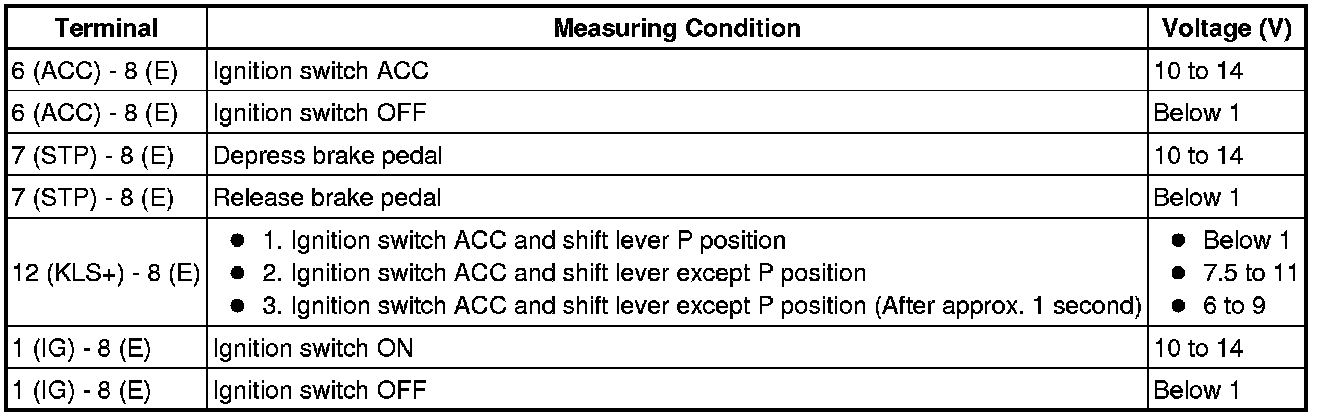 (d) Turn the ignition switch to the ON position, depress the brake pedal and check that the shift lever can be moved to another position. If operation can not be done as specified, inspect the shift lock control unit.