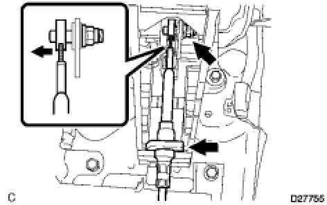 HINT: When the transmission control cable end is pressed, it can be removed from the floor shift lever.