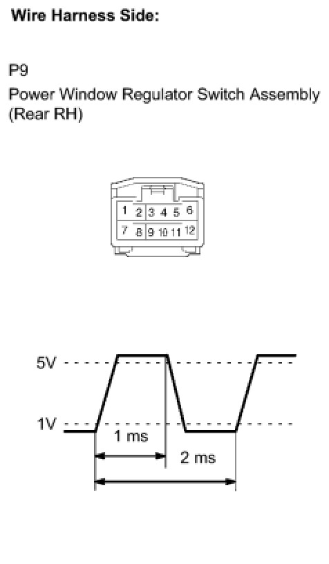 (c) Using an oscilloscope, check the waveform of terminal 2 of the wire harness side connector when operating the passenger side switch of the power window master switch.