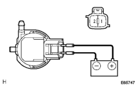 (2) Connect the battery (+) to terminal 1 of the washer motor and the pump, the battery (-) to terminal 2 of the washer motor and the pump. Check that the water comes out from the washer jar.