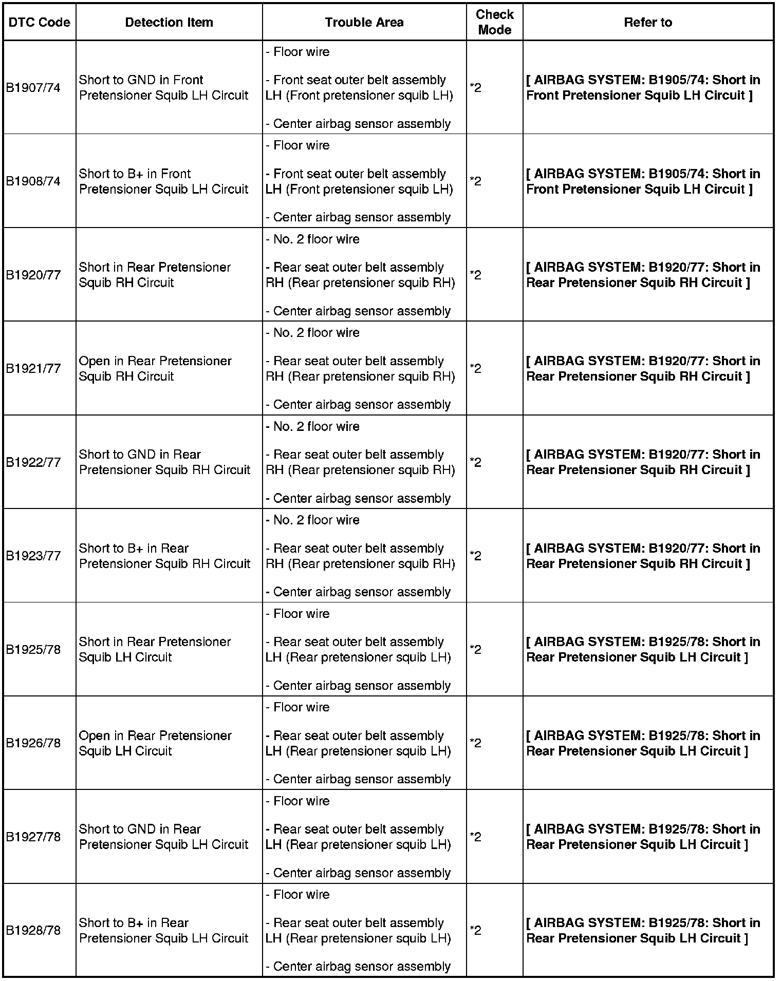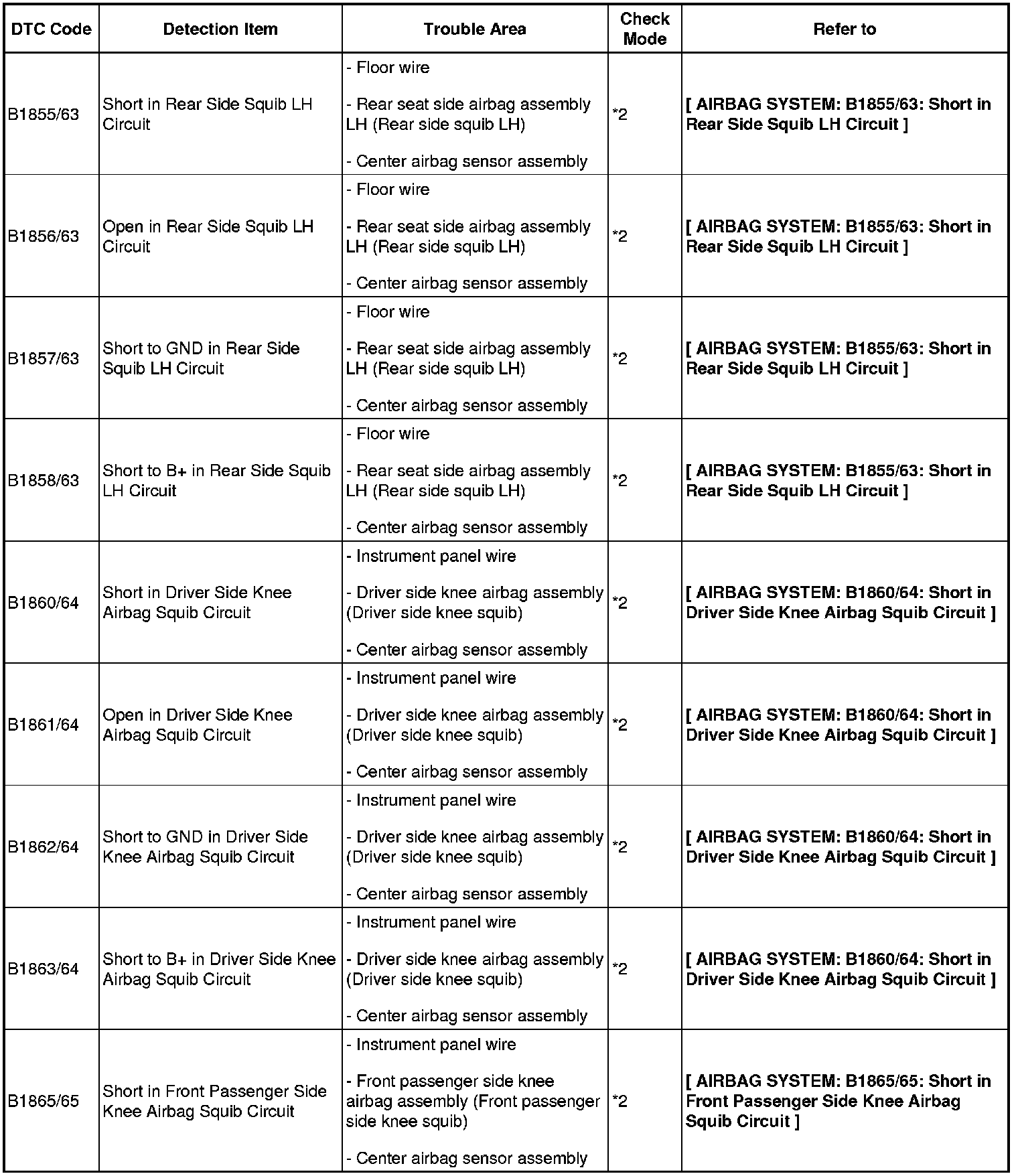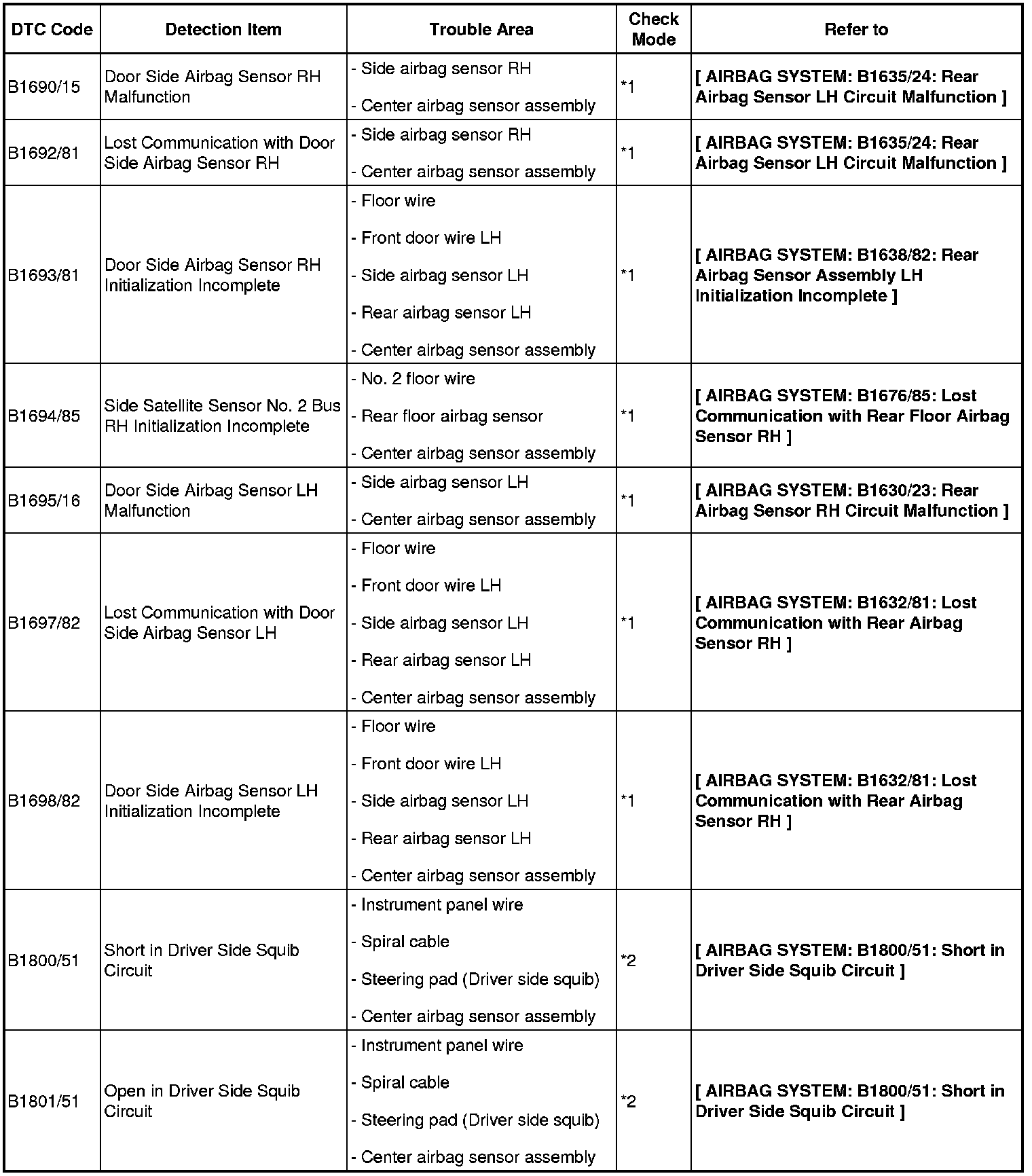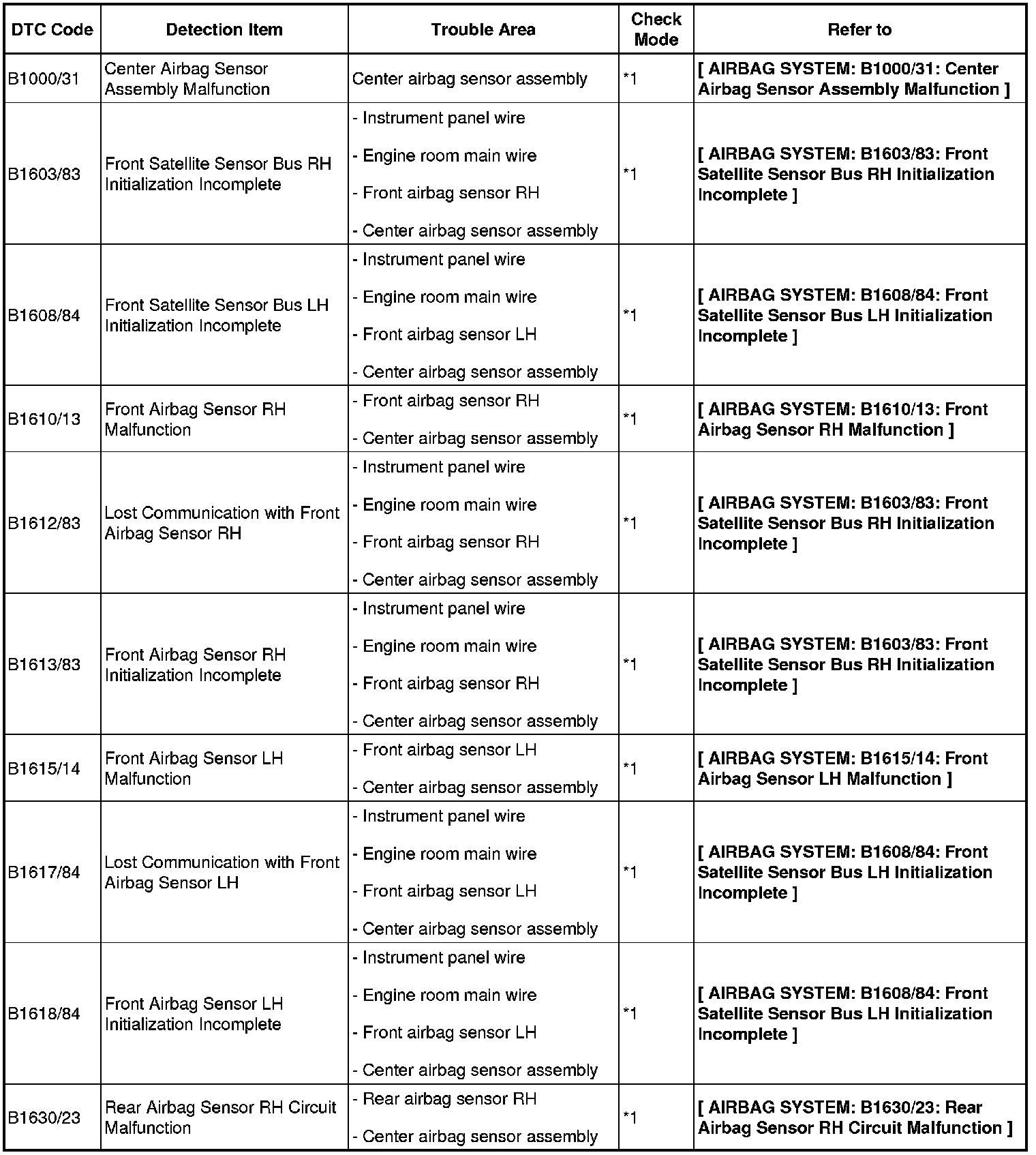 - If a code not listed in the chart is output, the center airbag sensor may have a malfunction.