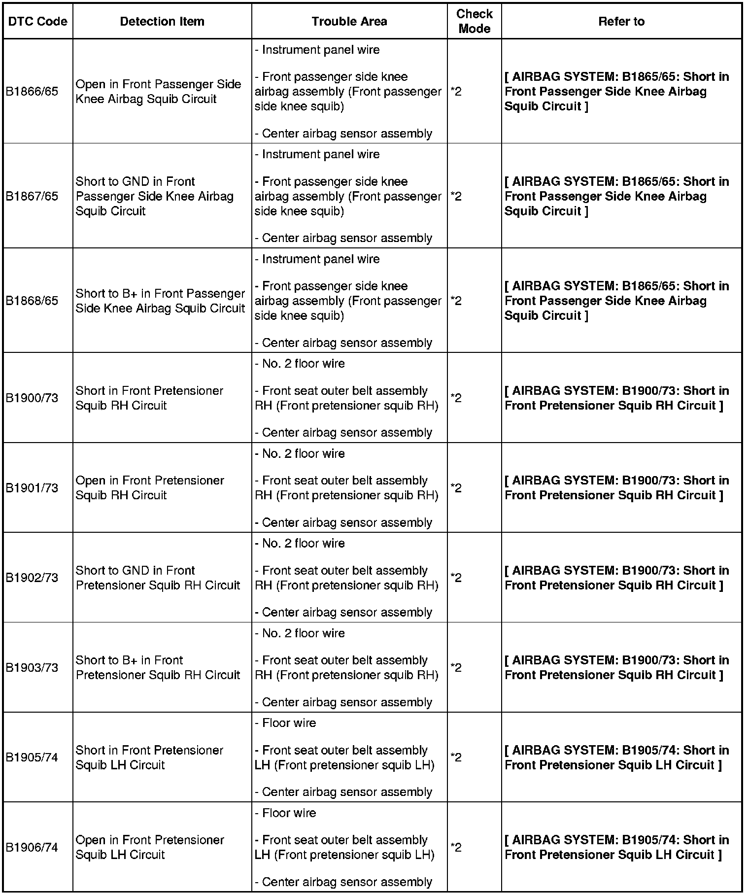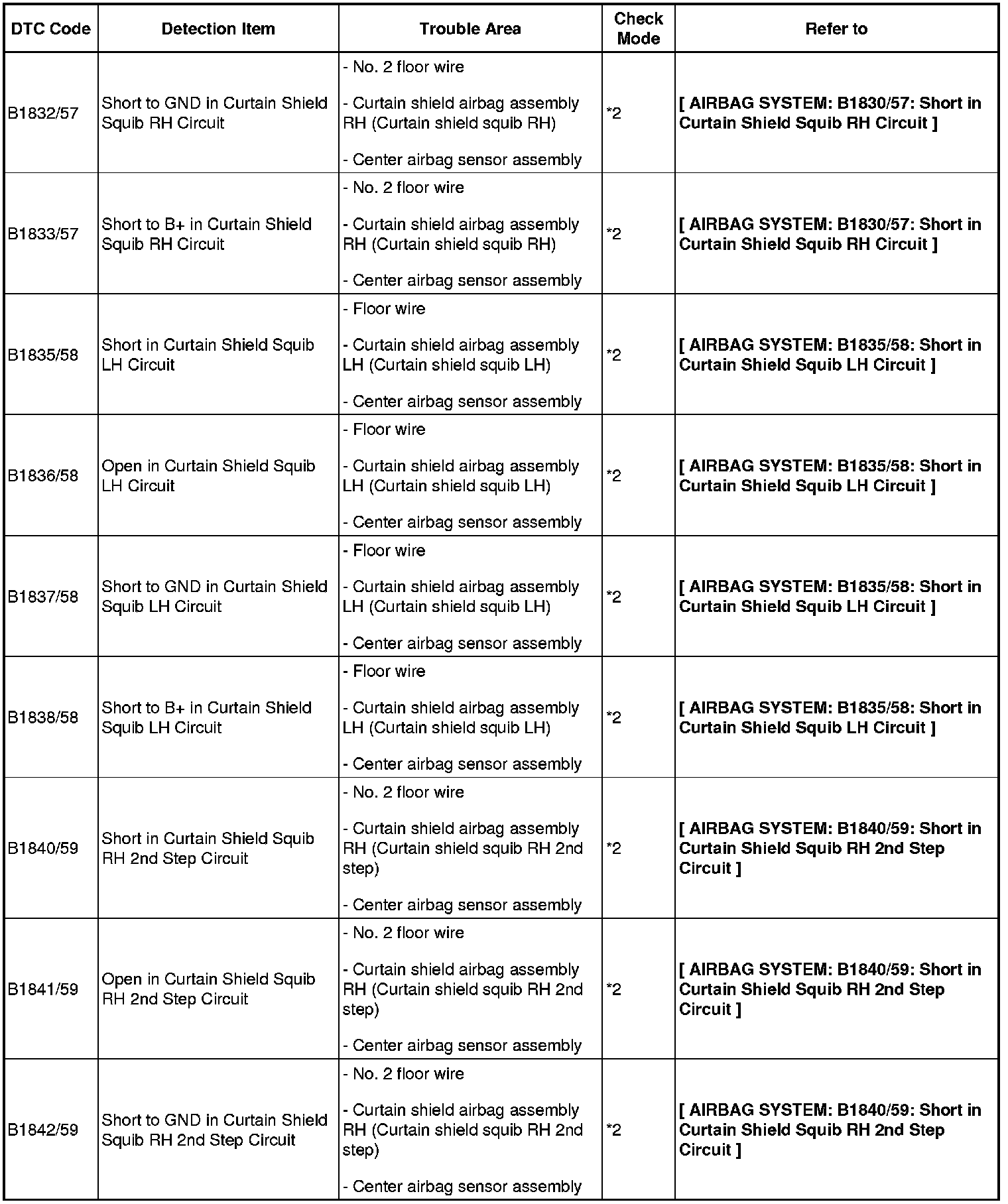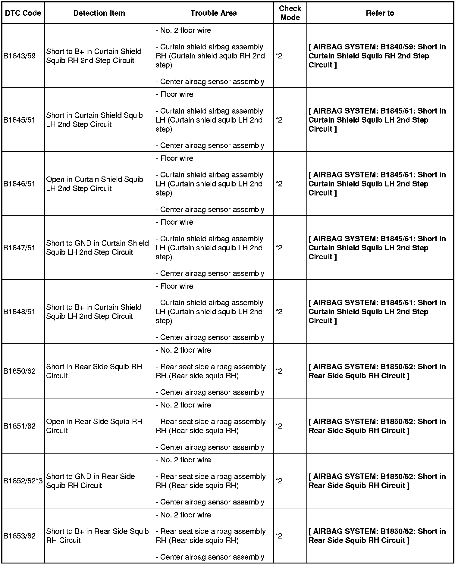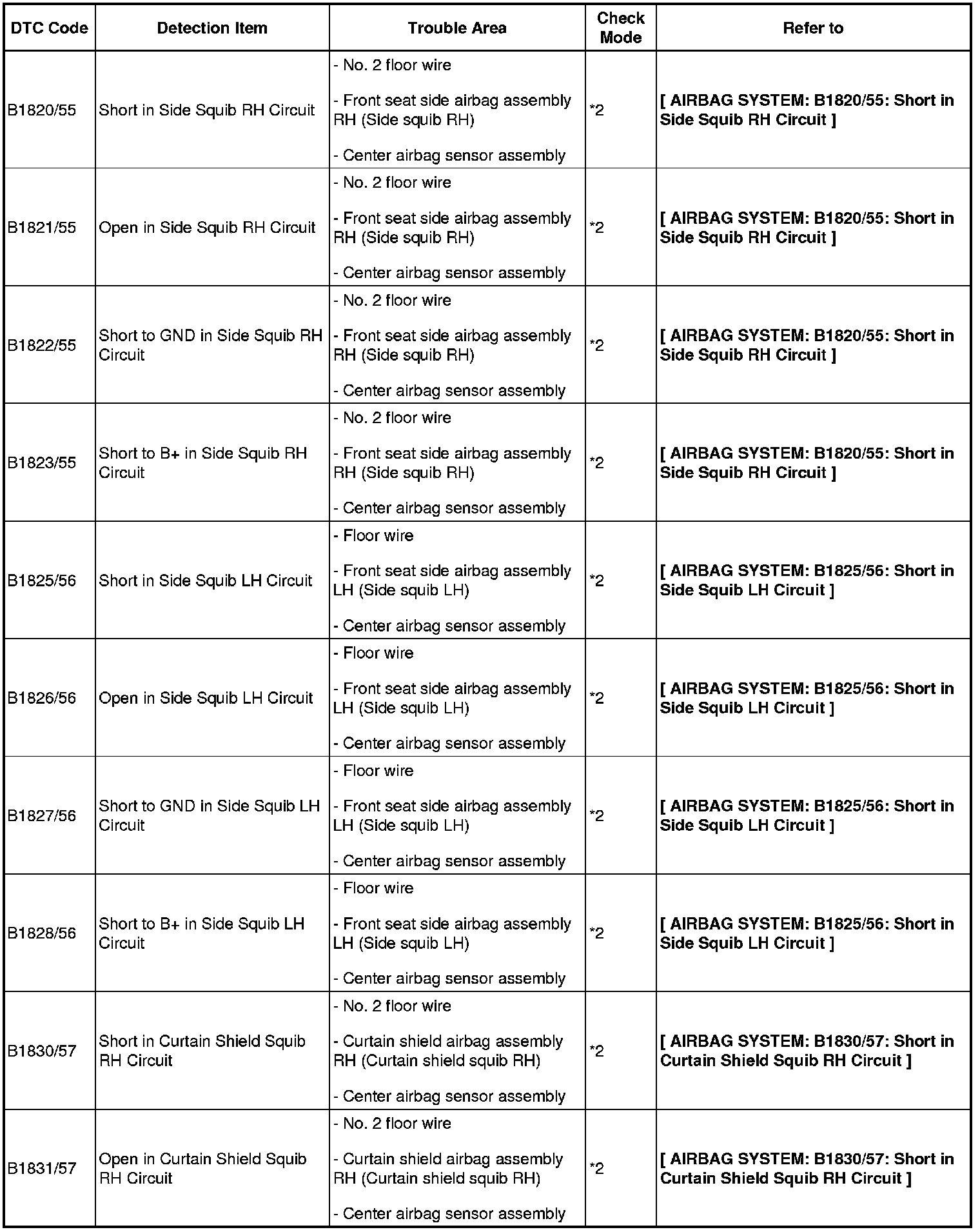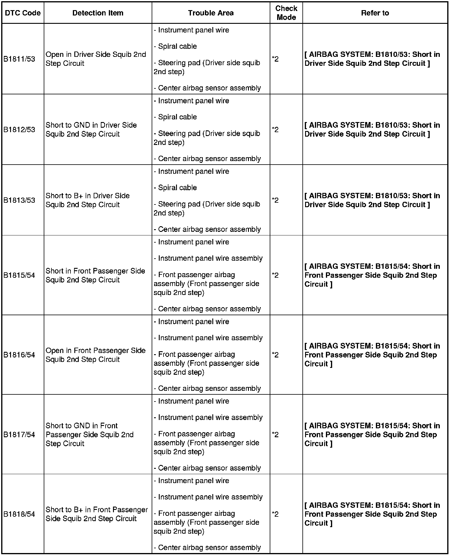 - If a code not listed in the chart is output, the center airbag sensor may have a malfunction.