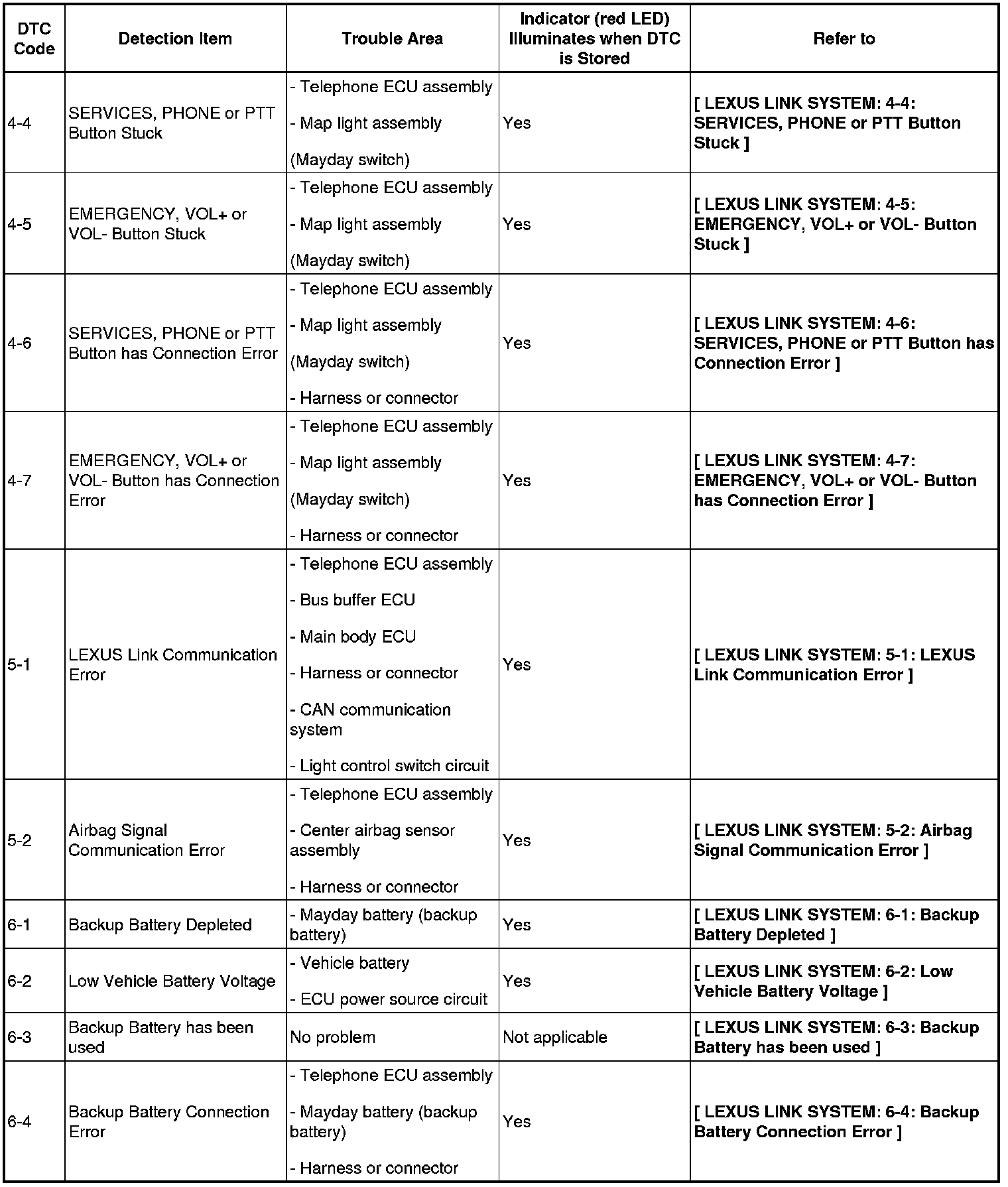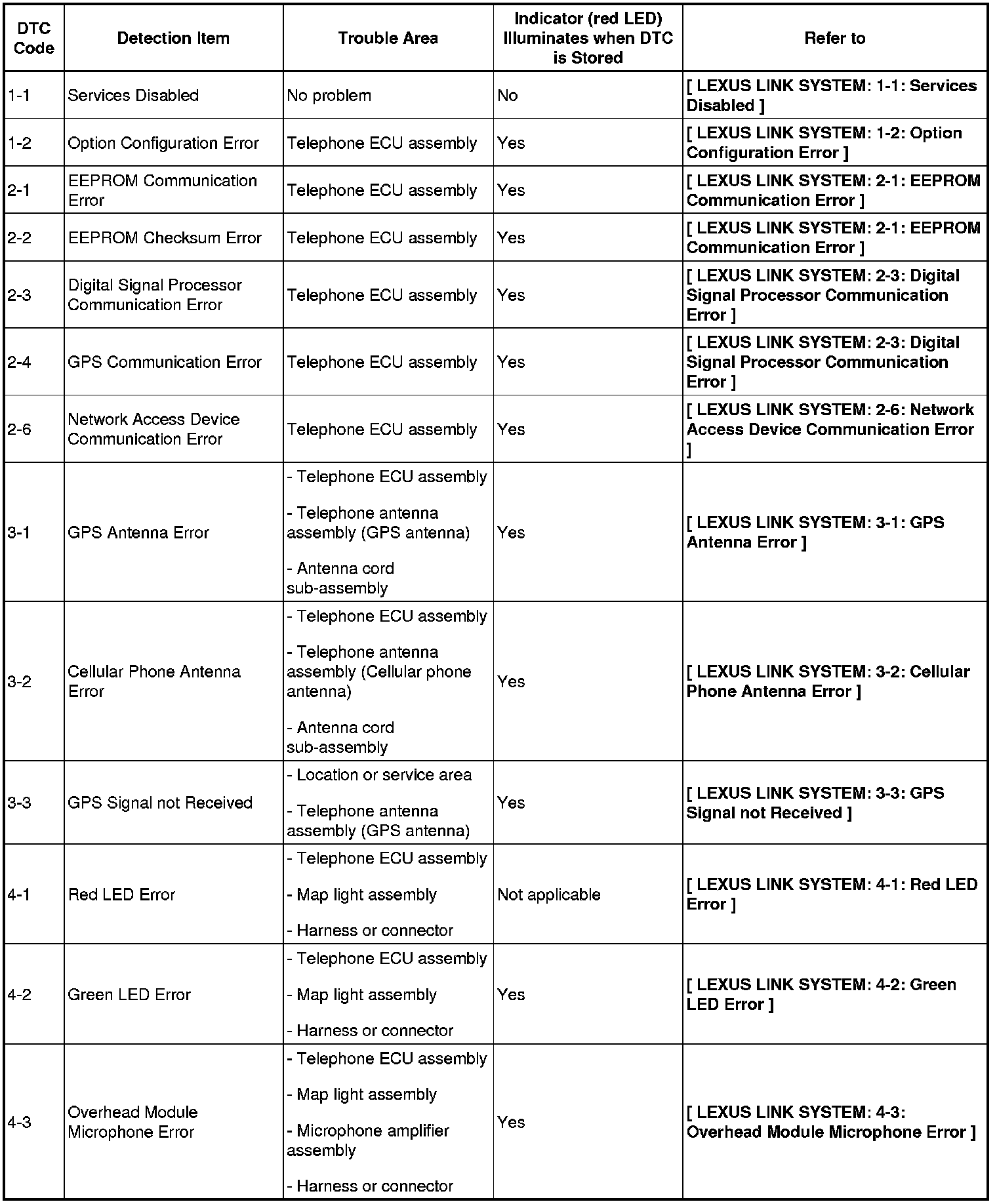 CELLULAR COMMUNICATION: LEXUS LINK SYSTEM: DIAGNOSTIC TROUBLE CODE CHART
