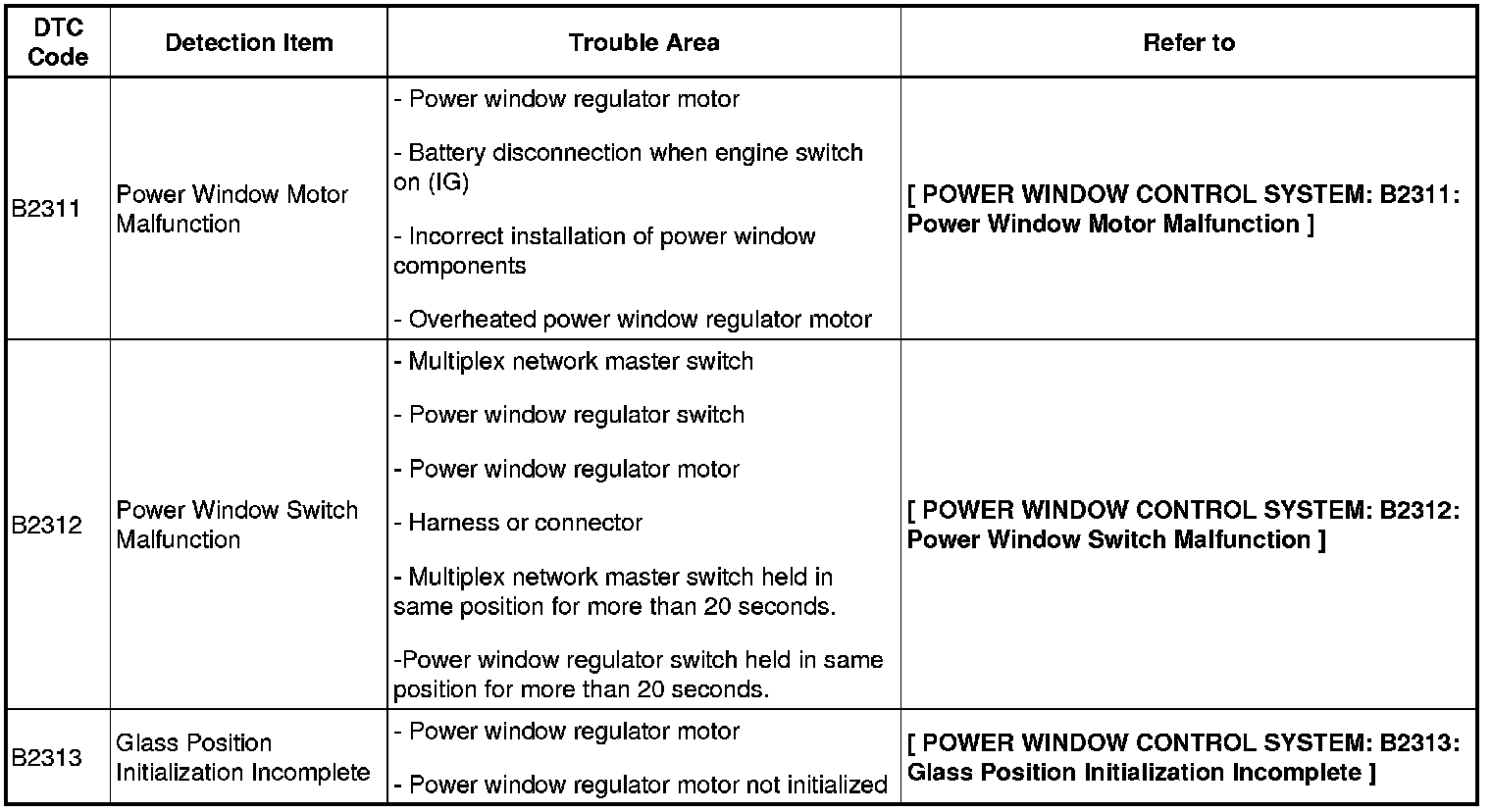 WINDOW / GLASS: POWER WINDOW CONTROL SYSTEM: DIAGNOSTIC TROUBLE CODE CHART