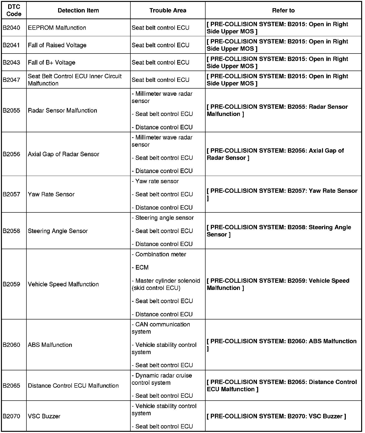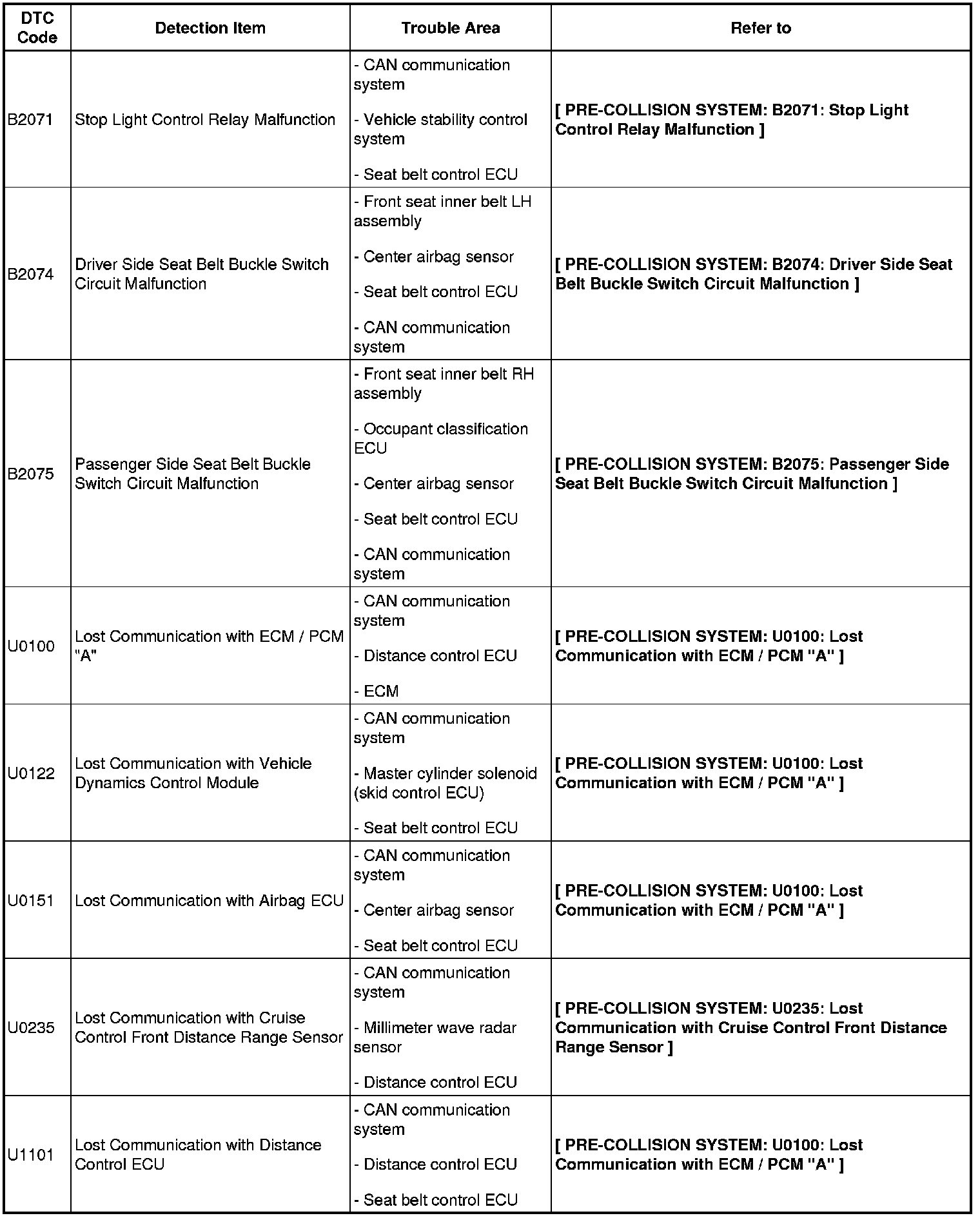 PRE-COLLISION: PRE-COLLISION SYSTEM: DIAGNOSTIC TROUBLE CODE CHART