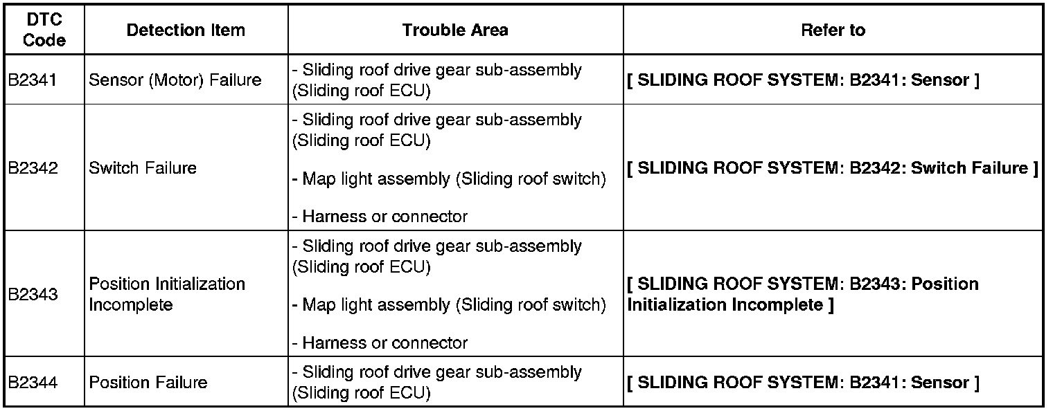 SLIDING ROOF / CONVERTIBLE: SLIDING ROOF SYSTEM: DIAGNOSTIC TROUBLE CODE CHART