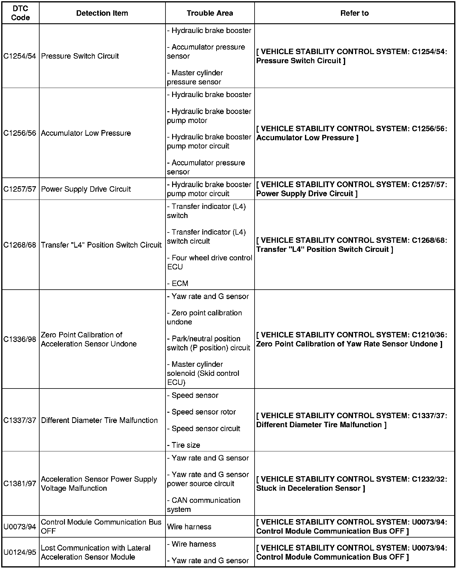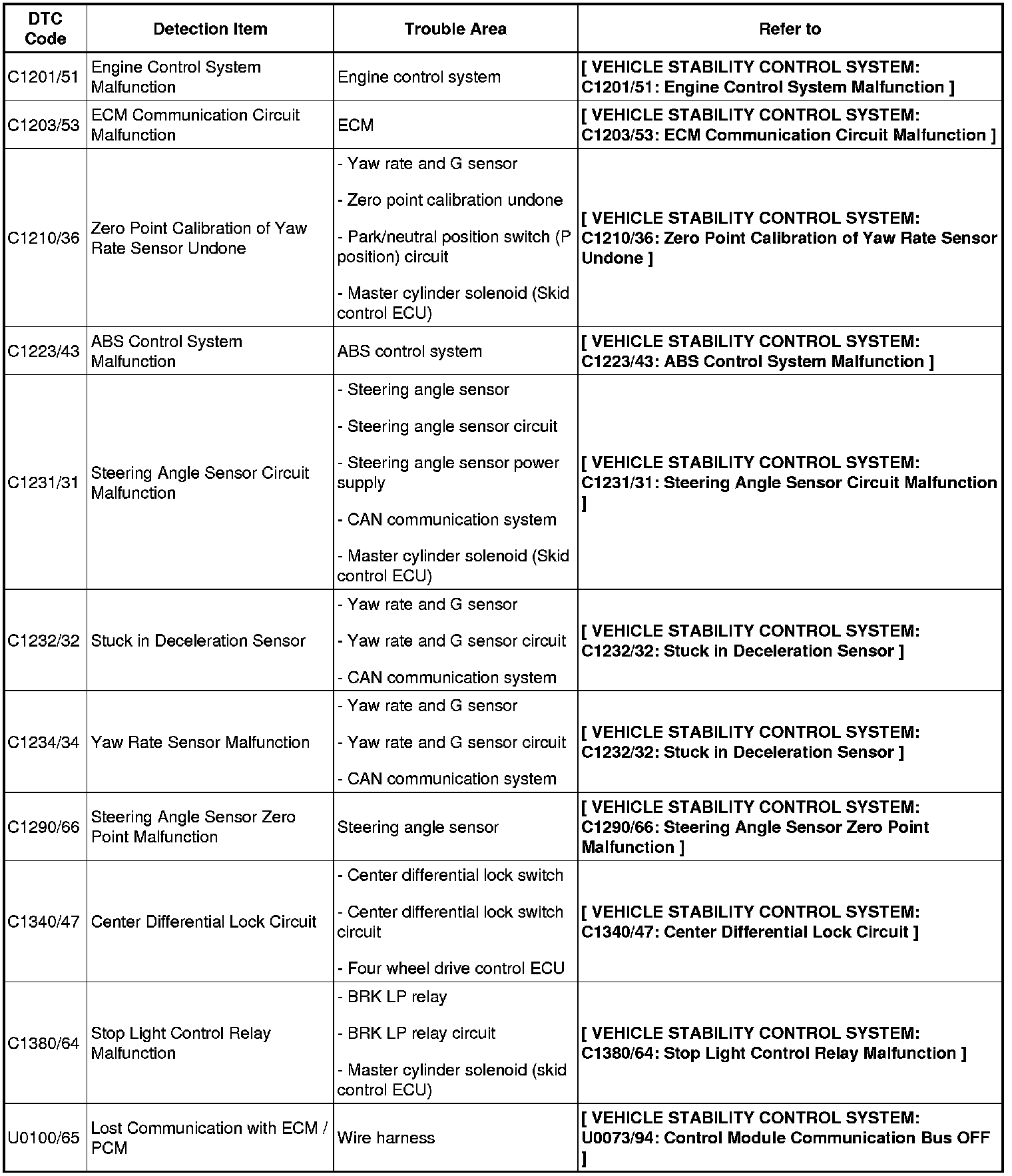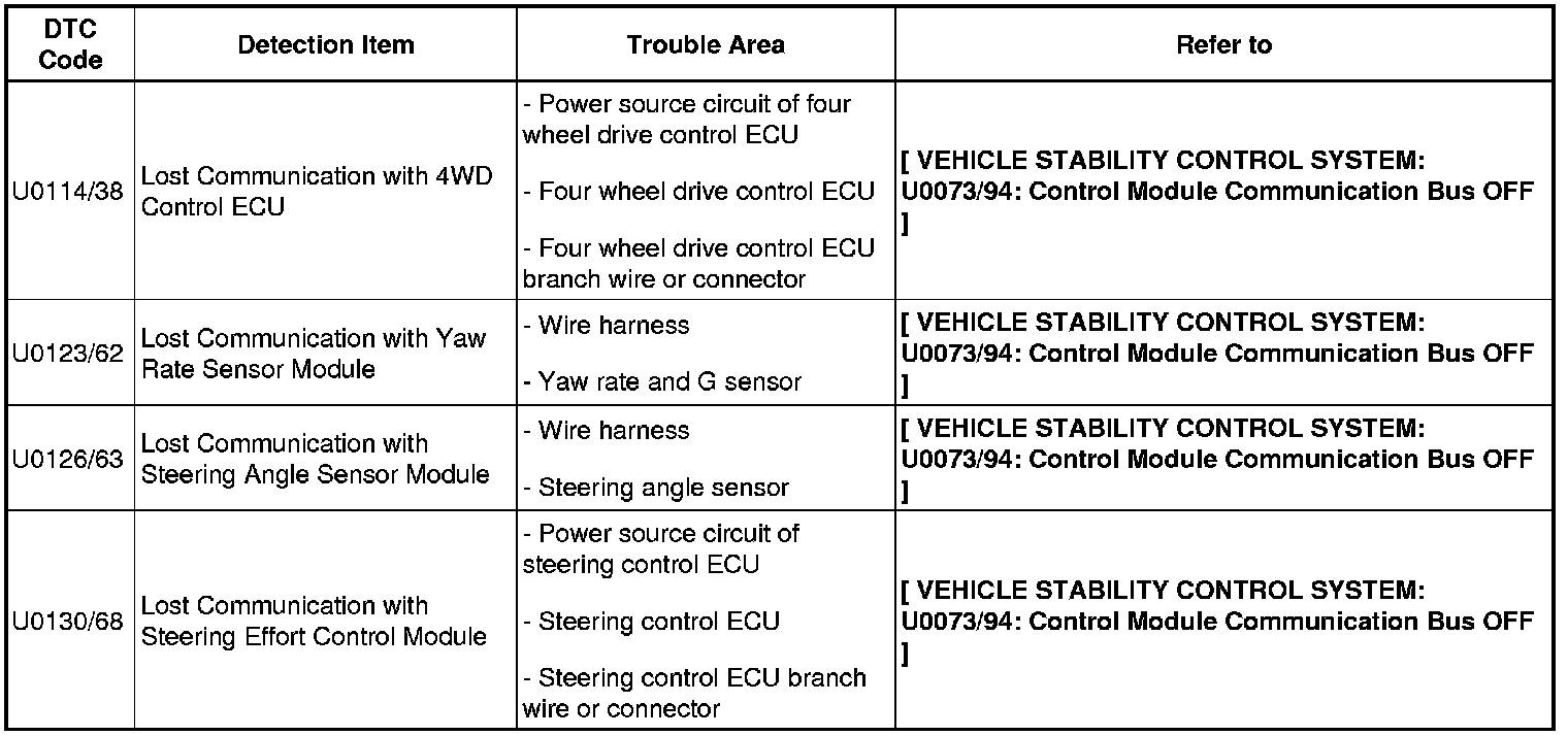 BRAKE CONTROL / DYNAMIC CONTROL SYSTEMS: VEHICLE STABILITY CONTROL SYSTEM: DIAGNOSTIC TROUBLE CODE CHART