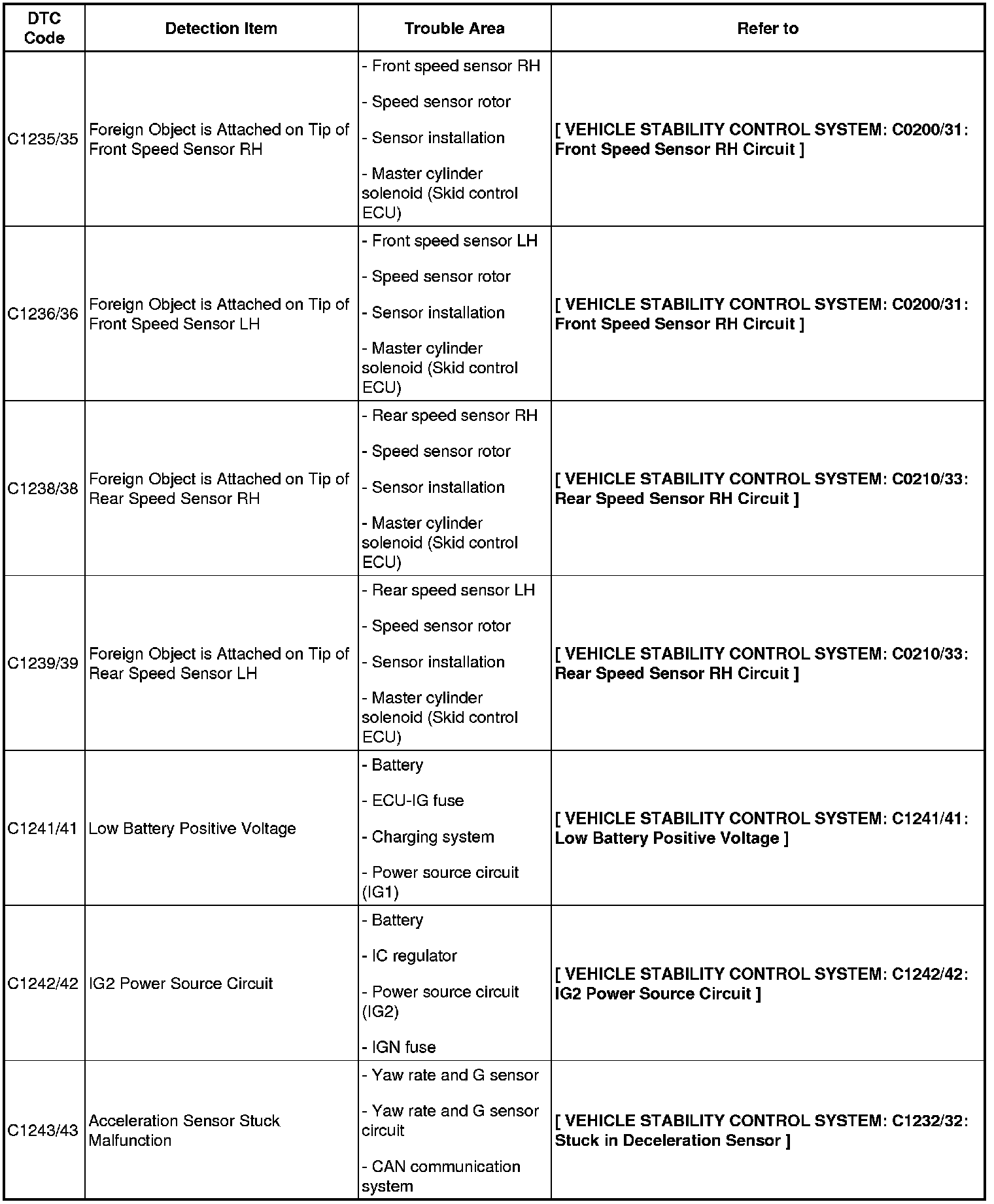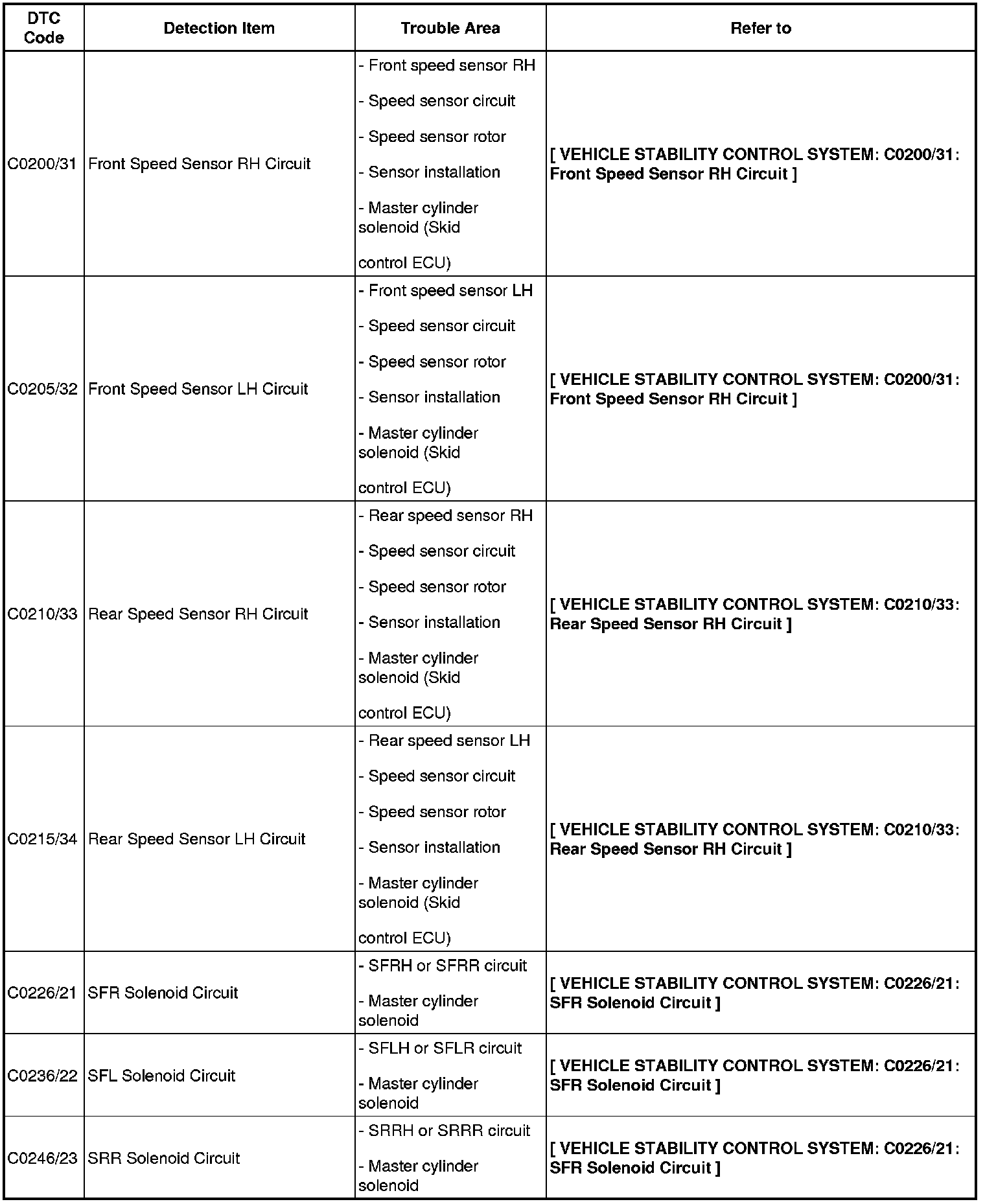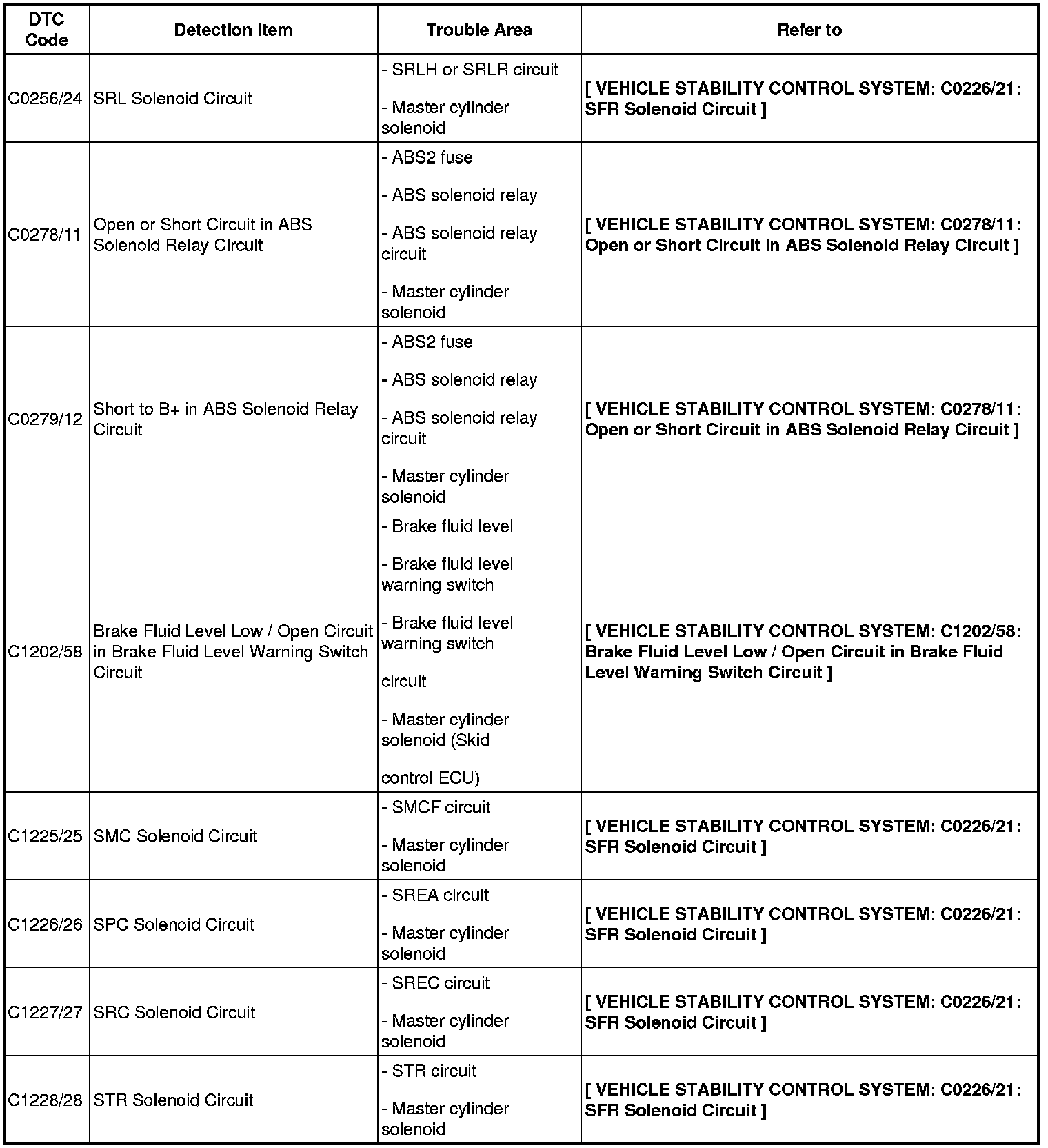 BRAKE CONTROL / DYNAMIC CONTROL SYSTEMS: VEHICLE STABILITY CONTROL SYSTEM: DIAGNOSTIC TROUBLE CODE CHART