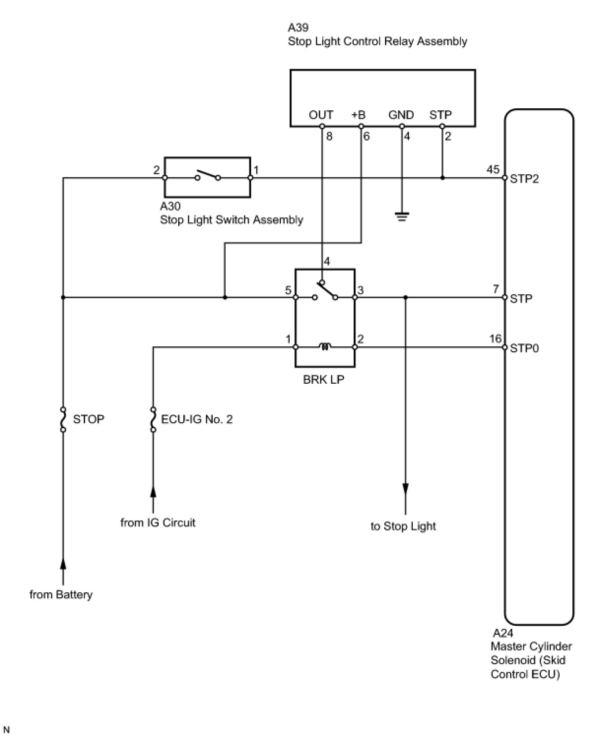 If an open in the stop light switch input line or GND side stop light circuit is detected when the stop light switch is off, this DTC is stored.