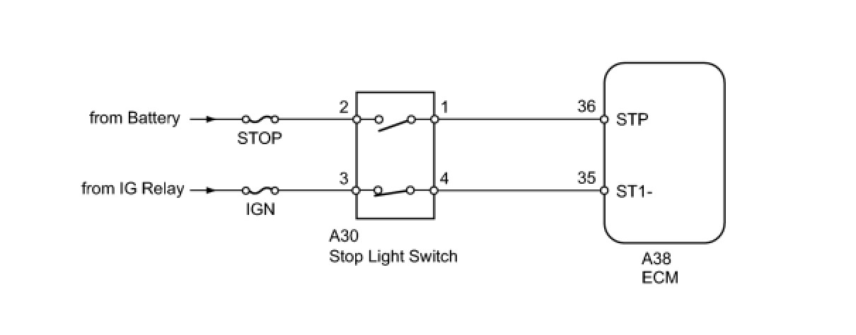 When the brake pedal is depressed, the stop light switch sends a signal to the ECM. When the ECM receives this signal, it cancels the cruise control. The fail-safe function operates to enable normal driving even if there is a malfunction in the stop light signal circuit. The cancellation condition occurs when voltage is applied to terminal STP. When the brake is applied, voltage is applied to terminal STP of the ECM through the STOP fuse and the stop light switch, and the ECM turns the cruise control off.