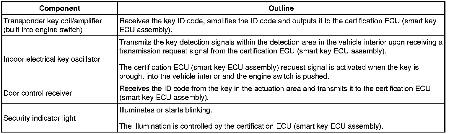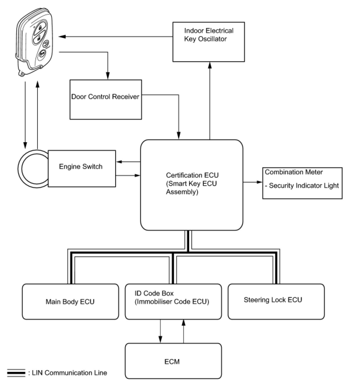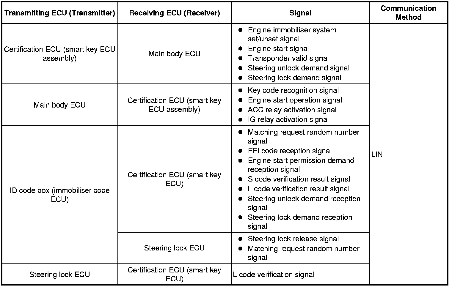 (a) The engine immobilizer system determines whether or not to disable starting of the SFI system based on a comparison of the key ID code and the vehicle pre-registered code. The engine immobilizer system compares the vehicle certification ECU (smart key ECU assembly) pre-registered ID code with the key-embedded transponder chip ID code. If the ID codes do not match, the engine immobilizer system activates and the SFI system cannot be started. The certification ECU (smart key ECU assembly) manages communication with the SFI system, main body ECU, steering lock ECU and ID code box (immobilizer code ECU). When the ID codes of the transponder chip and certification ECU (smart key ECU assembly) match, the certification ECU (smart key ECU assembly) authorizes the starting of the SFI system.