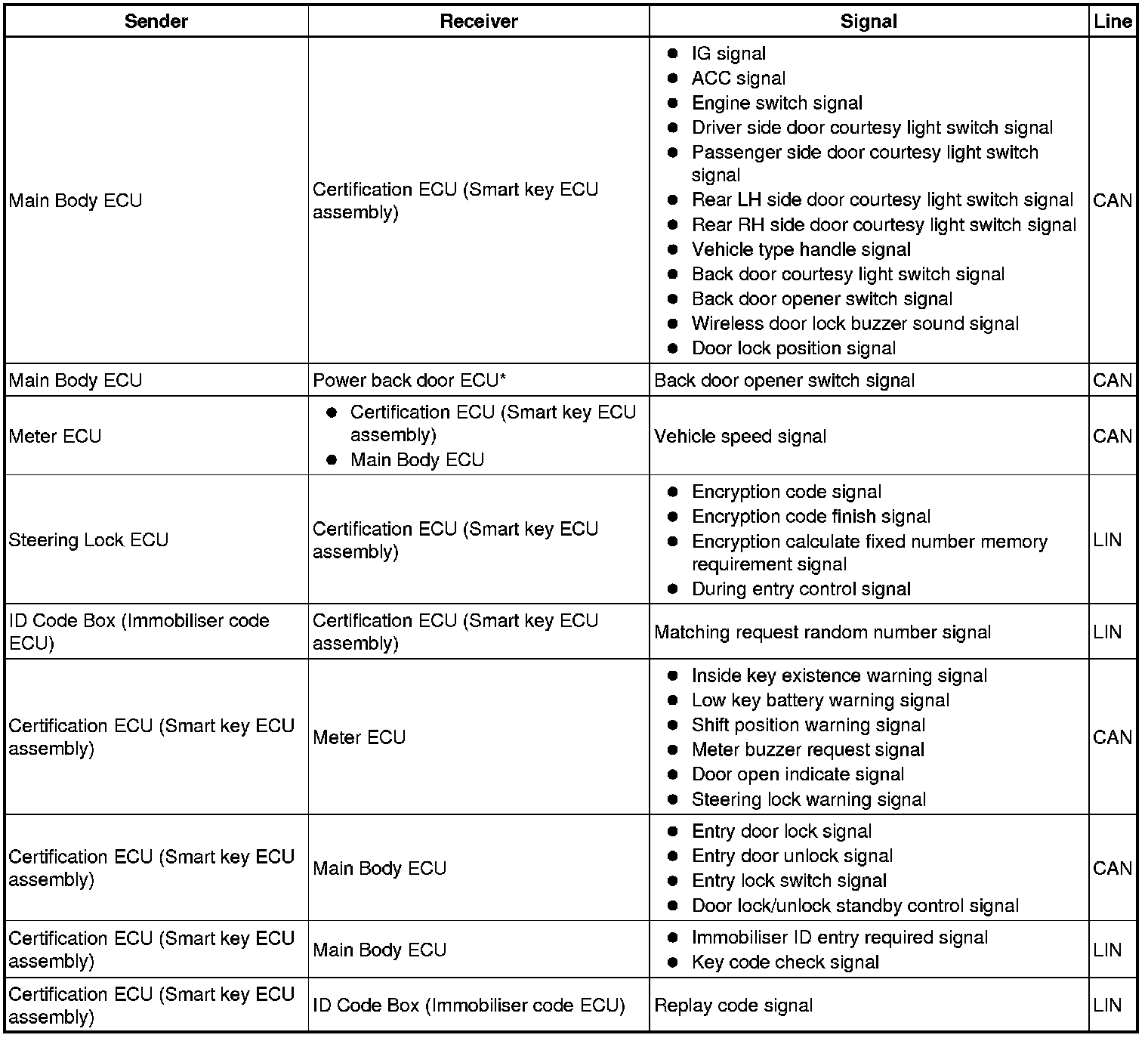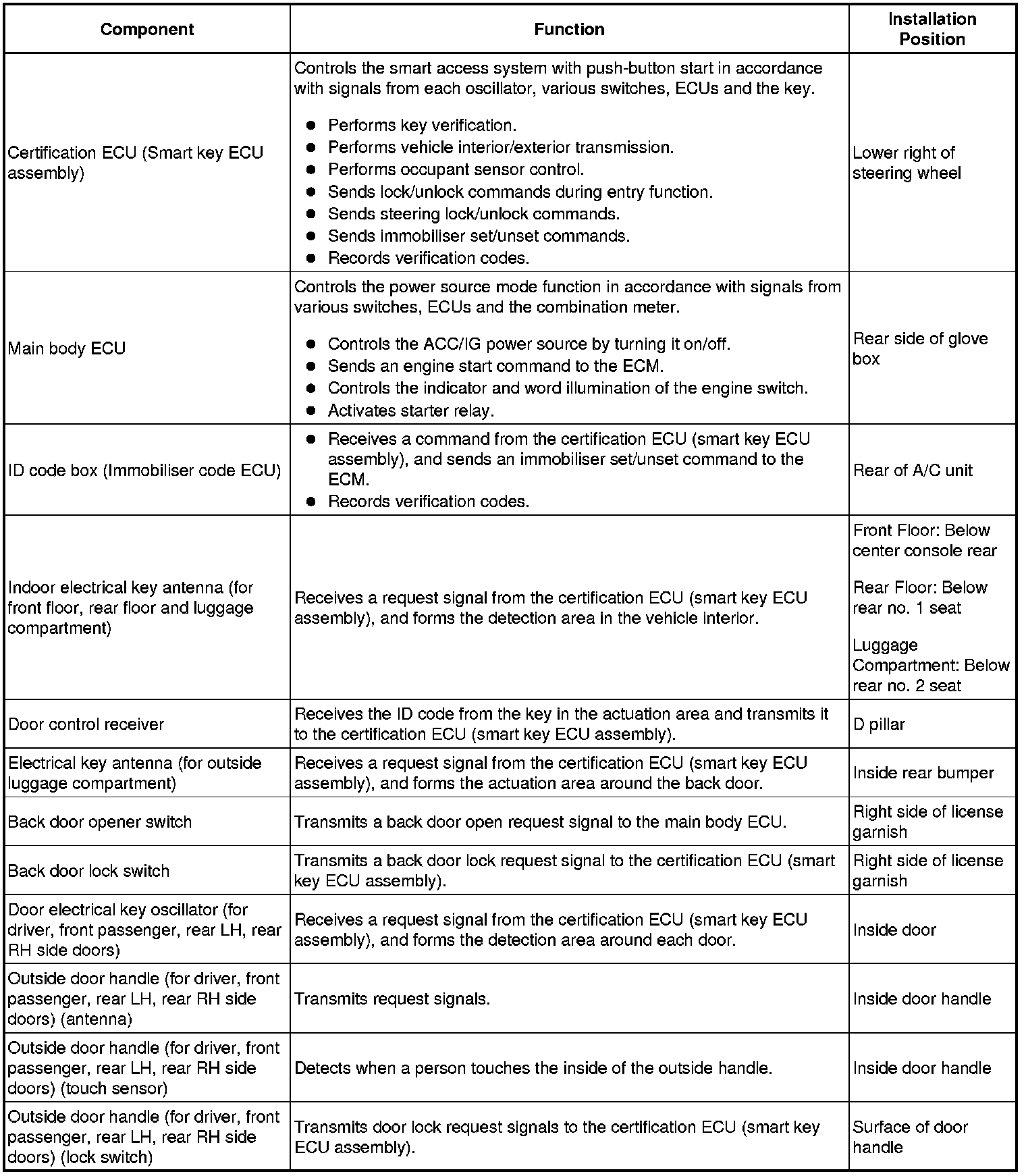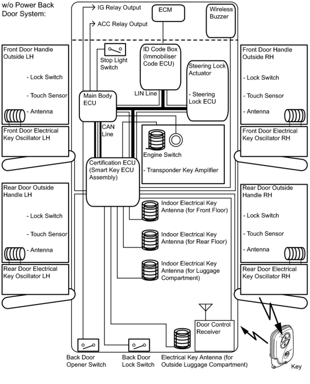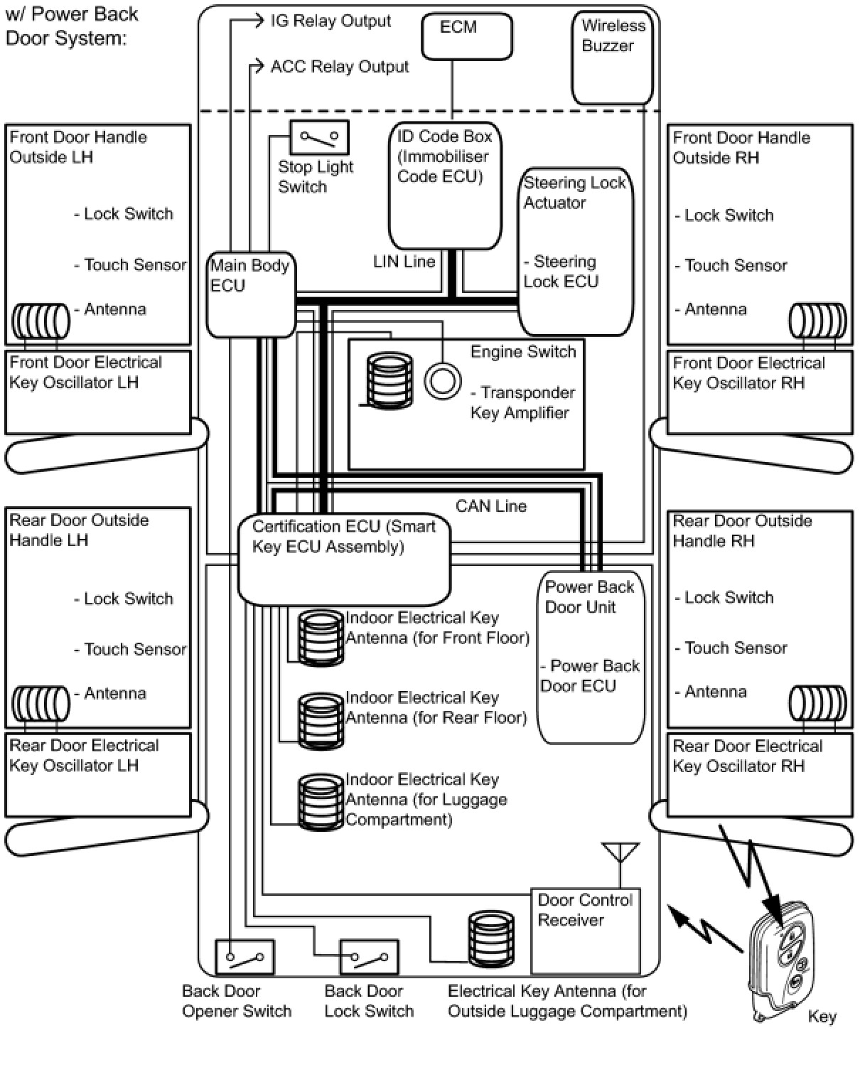 - This system is controlled by the certification ECU (smart key ECU assembly). When the certification ECU (smart key ECU assembly) detects the presence of the key in one of the detection areas, it identifies and checks the ID code, and outputs operation signals to the related ECU in accordance with their functions.