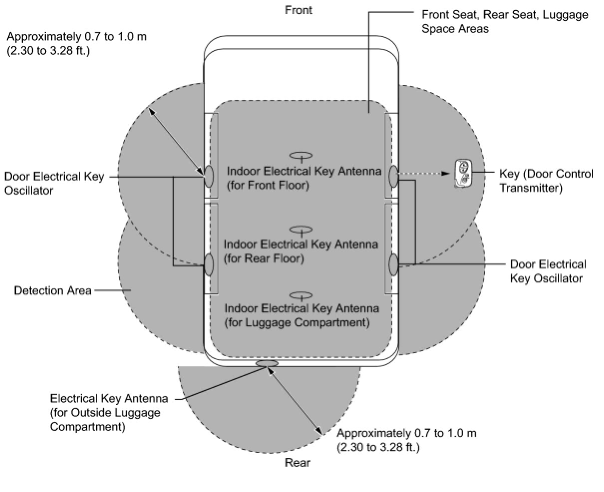 - The detection area of each door oscillator is formed by transmitting a request signal every 0.25 seconds while the engine switch is off and each door is locked. In this way, it detects the proximity of a key. During entry lock, the detection area is formed with the lock switch on.