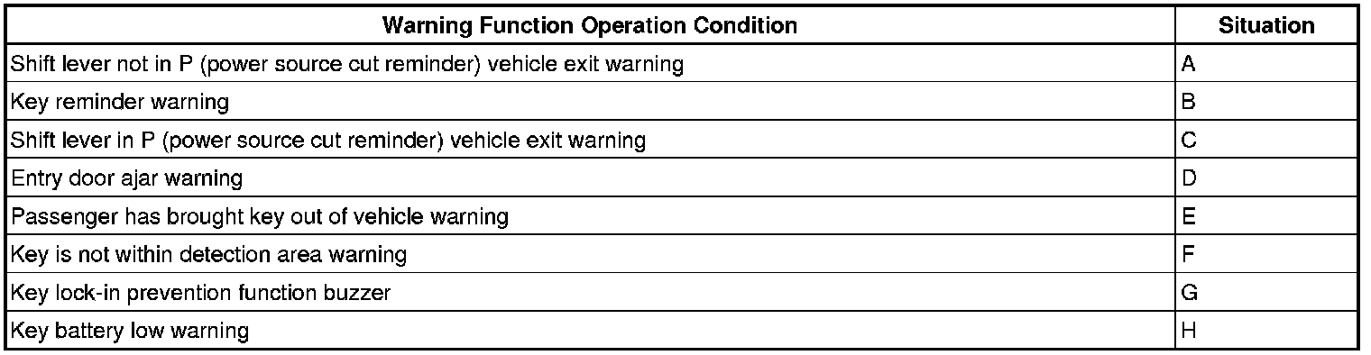 When any of the situations below occur, the smart access system with push-button start responds to alert the driver.
