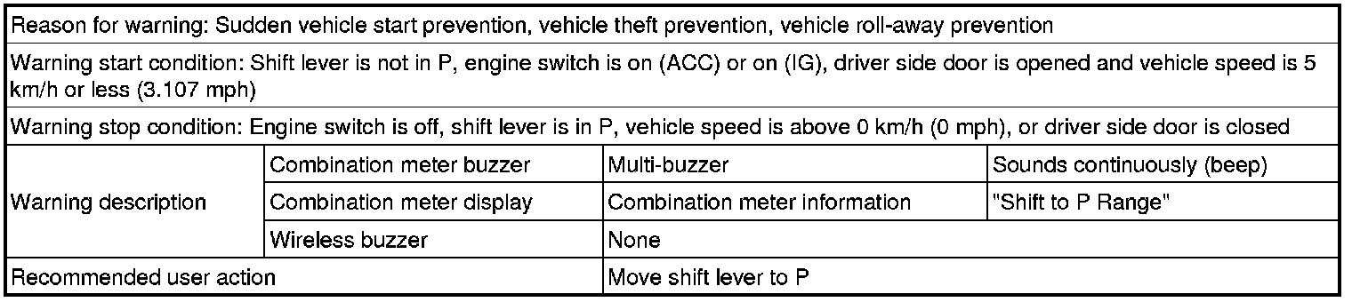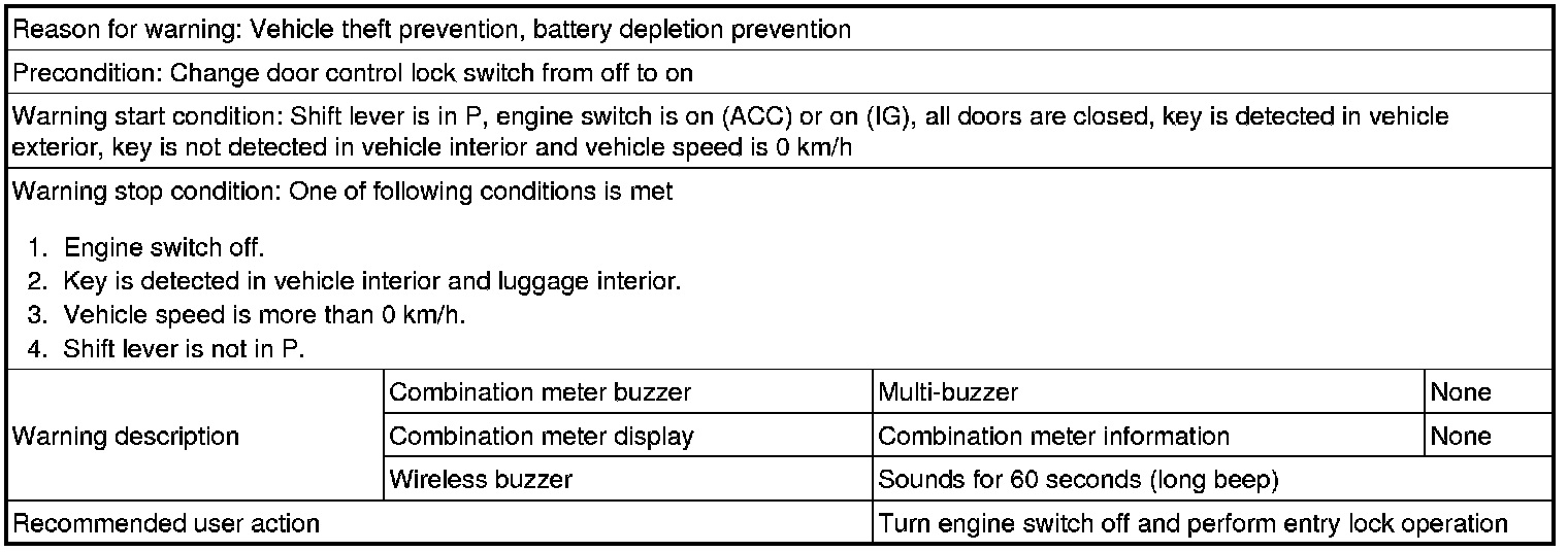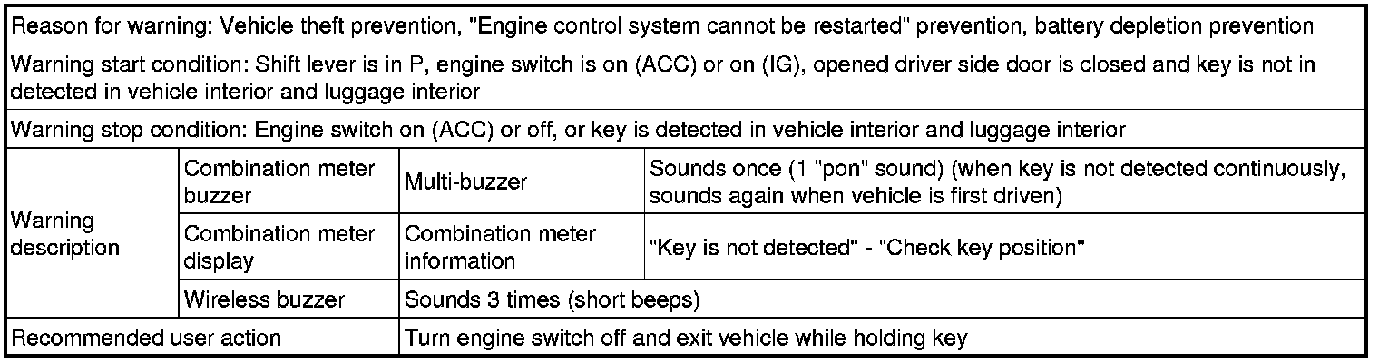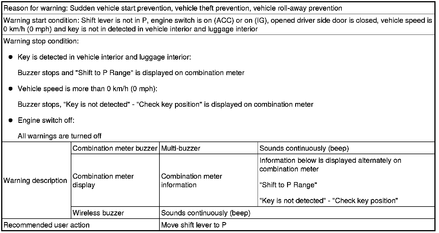 (1) With shift lever not in P, door is opened and vehicle exit (while holding key) is attempted