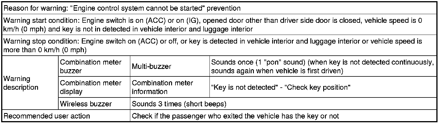 (1) With engine switch in condition other than off, key is brought out of vehicle by passenger