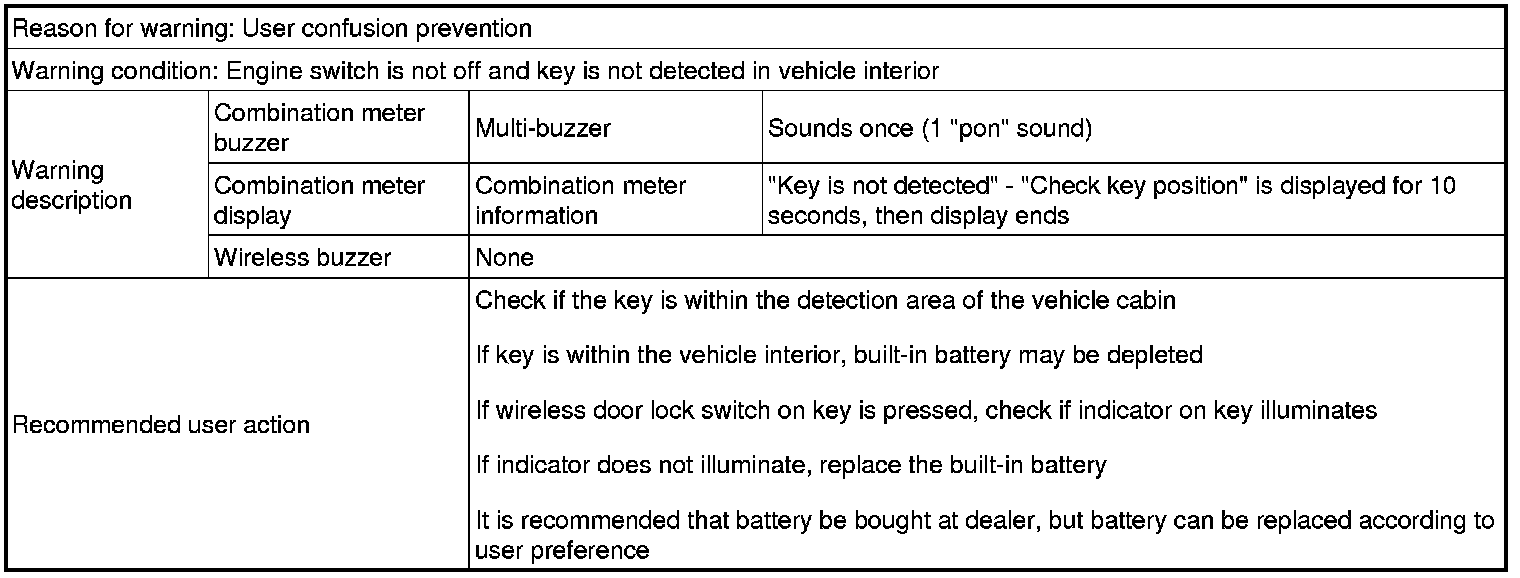 (d) If the key is located inside of the cabin, the door lock function will not operate and the alarm buzzer (beep sound) will sound for 2 seconds.