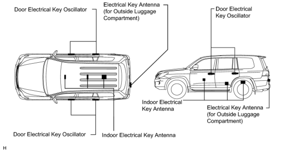 (5) If the key is outside the vehicle but is very close to a window or door handle (the ECU determines that the key is inside the vehicle) and the transmitter or mechanical key is used to lock the doors (entry lock is not used), entry unlock will not operate. To unlock the doors, perform a wireless door unlock operation. The entry lock function operates in this way to prevent the doors from being unlocked by the door oscillator (vehicle exterior) without the knowledge of the user. For example, when a user operates the wireless door lock operation from inside the vehicle, radio waves from a door oscillator may leak into the vehicle interior and the doors may unlock.
