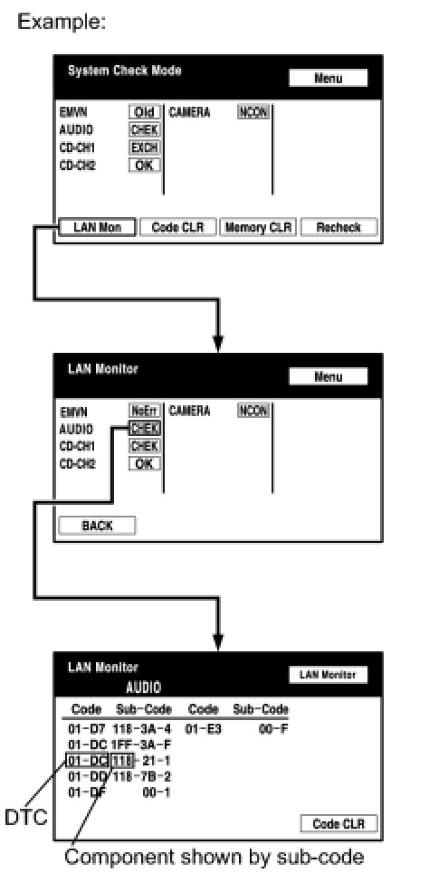 (2) Check for an open or short in the AVC-LAN circuit between the display and navigation module display and the component shown by the sub-code.