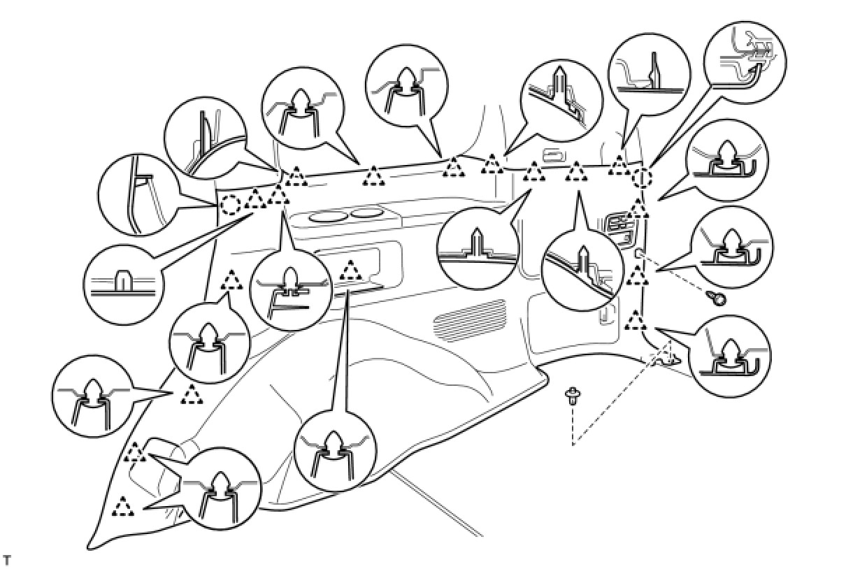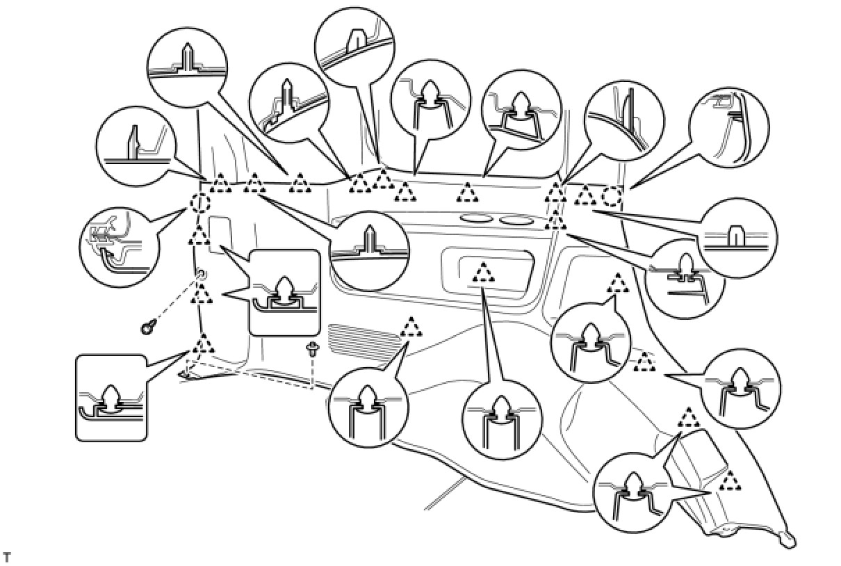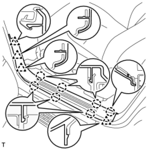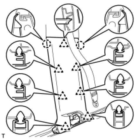 (2) Attach the 19 clips and 2 claws to install the quarter trim panel.