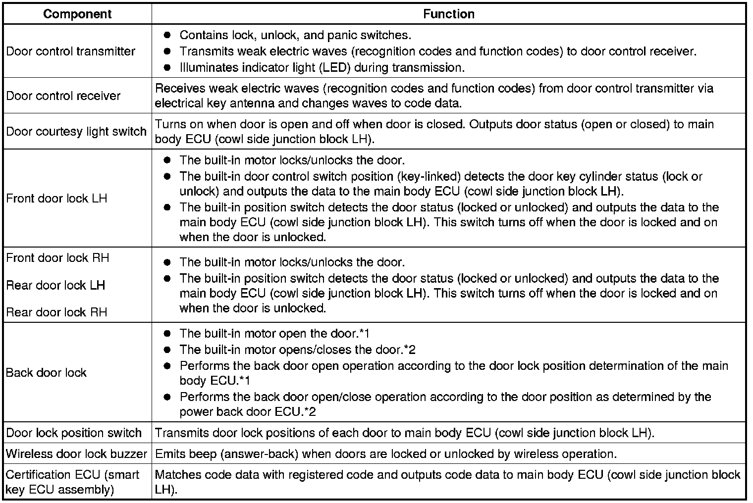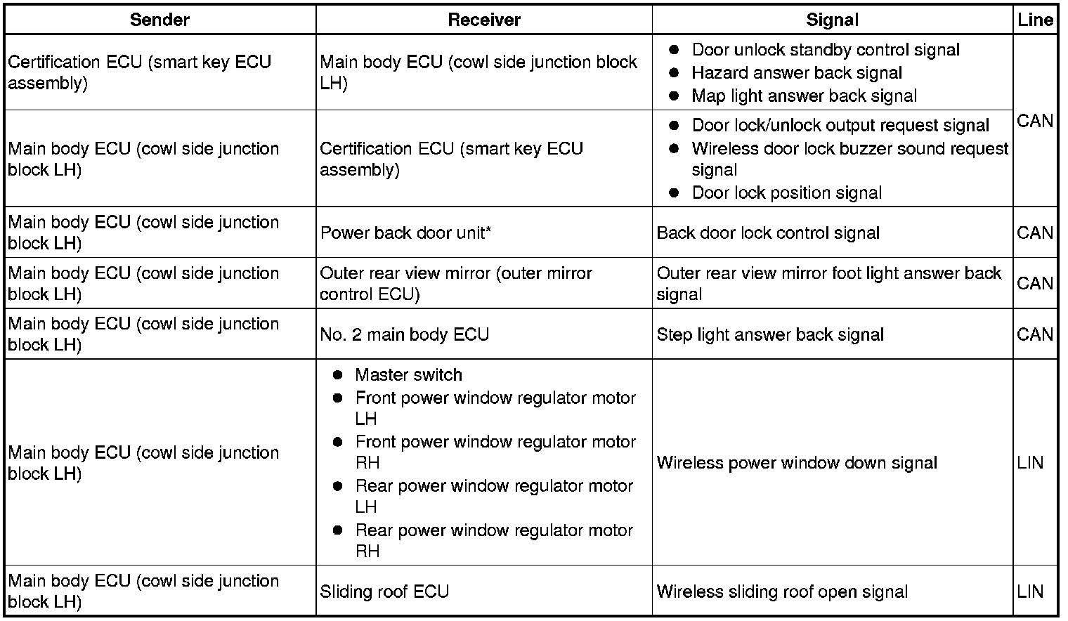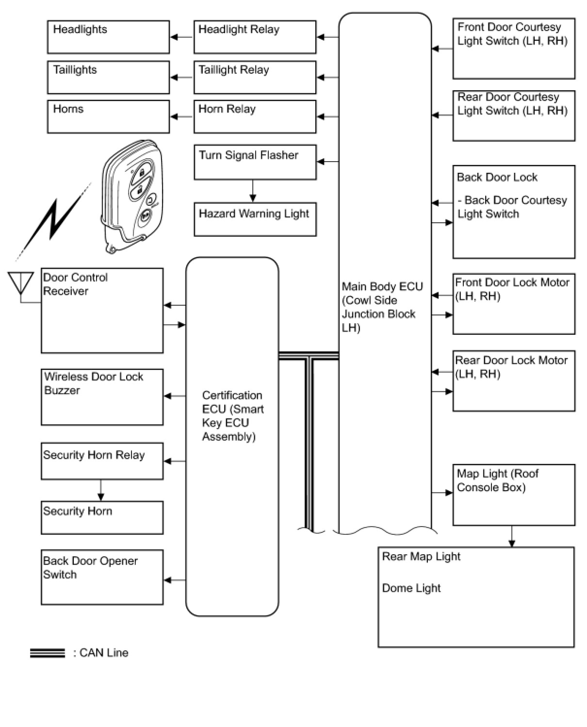 - The certification ECU (smart key ECU assembly) performs the code identification process and the main body ECU (cowl side junction block LH) controls the door lock. A serial data link is provided for communication between the certification ECU (smart key ECU assembly) and main body ECU (cowl side junction block LH).