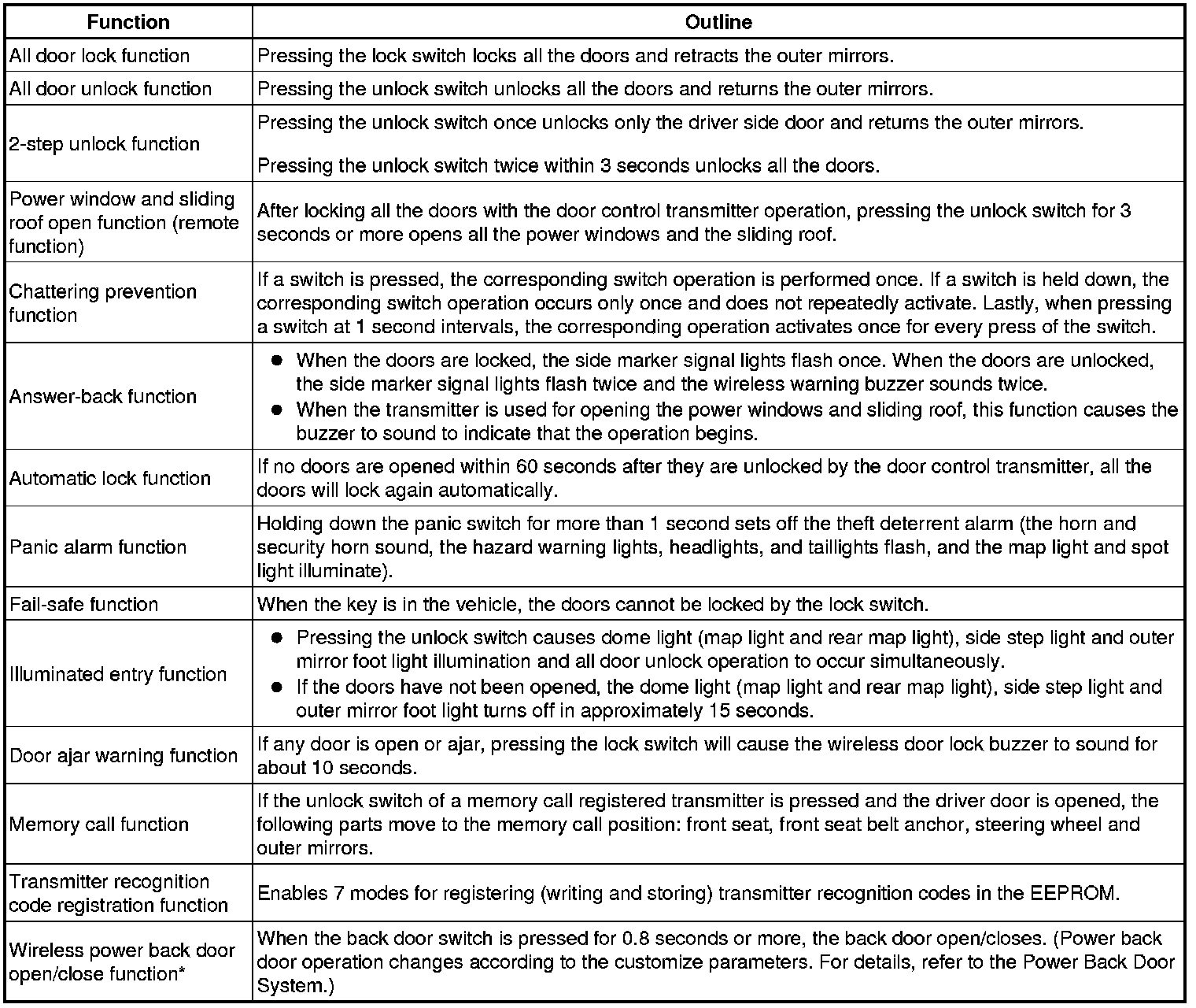 This system lock/unlocks the doors remotely. The wireless door lock control system has the following features: