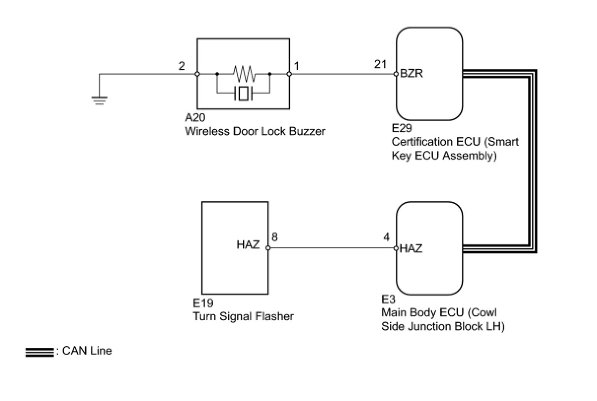 In some cases, wireless door lock control functions are normal but the turn signal lights and wireless door lock buzzer are not. Malfunctions may be present in the main body ECU (cowl side junction block LH), certification ECU (smart key ECU assembly), turn signal lights, and/or wireless door lock buzzer signal outputs.