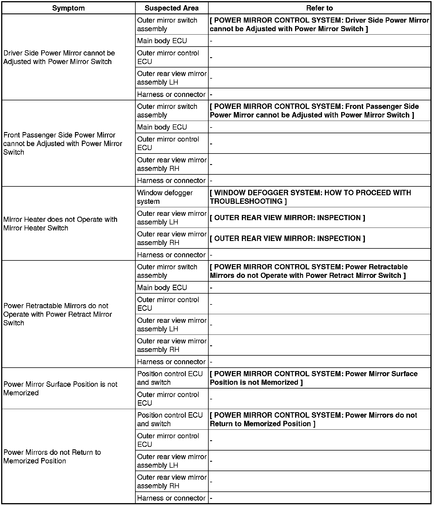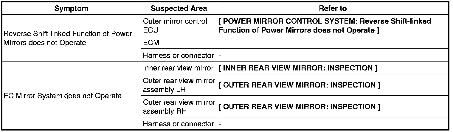 MIRROR (EXT): POWER MIRROR CONTROL SYSTEM: PROBLEM SYMPTOMS TABLE