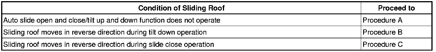 - When the sliding roof glass is replaced or removed and installed, or the drive gear assembly is replaced, the sliding roof drive gear requires initialization (pulse sensor initial position setting), as the glass position cannot be determined. If initialization is not performed, the auto slide open and close/tilt up and down function may not operate, or the sliding roof may move in reverse or become misaligned.